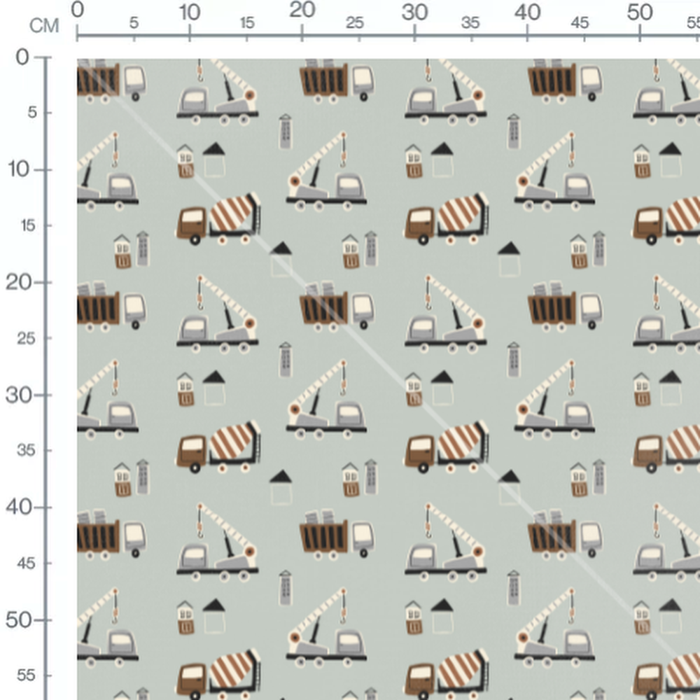 Les camions de chantier incluent des grues et des bétonnières. Les maisons sont stylisées avec des toits noirs et marron.Les tissus