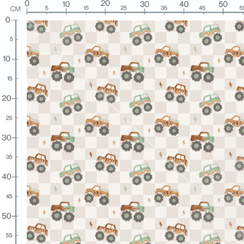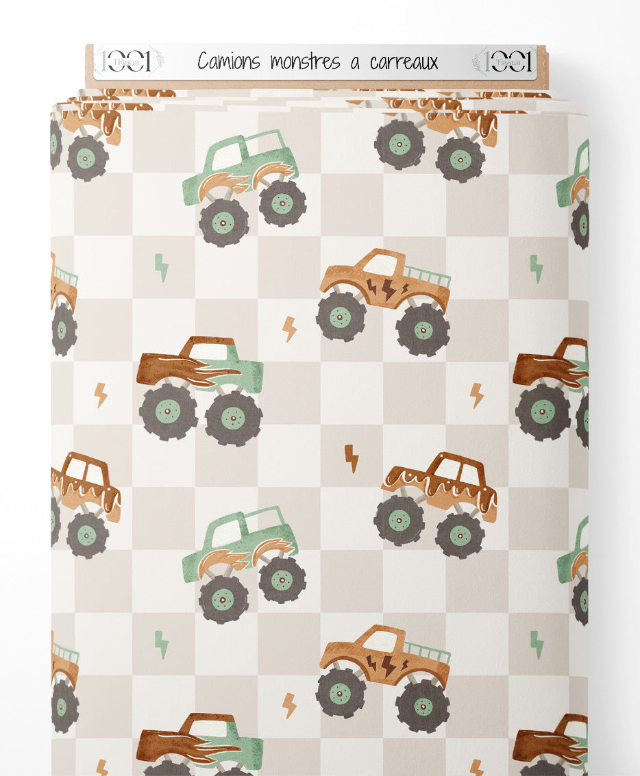 Les camions monstres présentent des motifs de flammes sur les côtés. Les roues sont grandes et de couleur grise. Les éclairs ajoutent une touche dynamique au motif.Les tissus