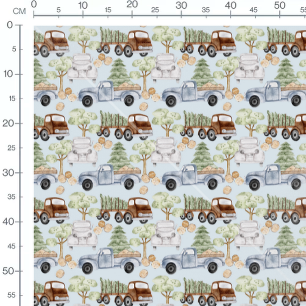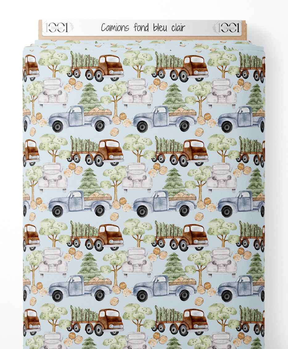 Les camions transportent des rondins de bois et des sapins. Les arbres sont dessinés dans un style aquarelle avec des nuances de vert. Les rondins de bois sont de couleur beige clair.Les tissus