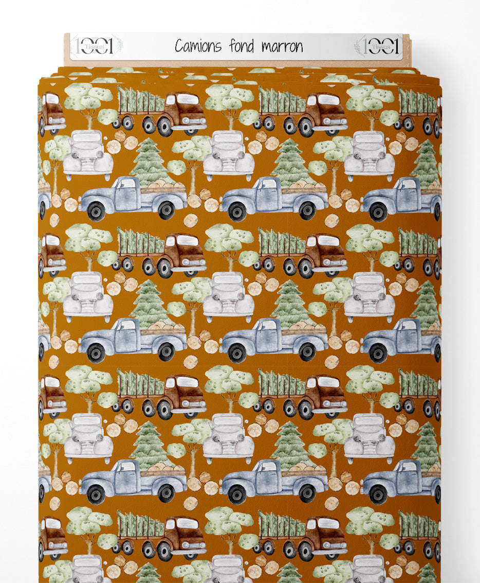 Les camions sont chargés de sacs et de bois. Les arbres incluent des sapins et des arbres feuillus. Les pierres sont dispersées autour des véhicules.Les tissus