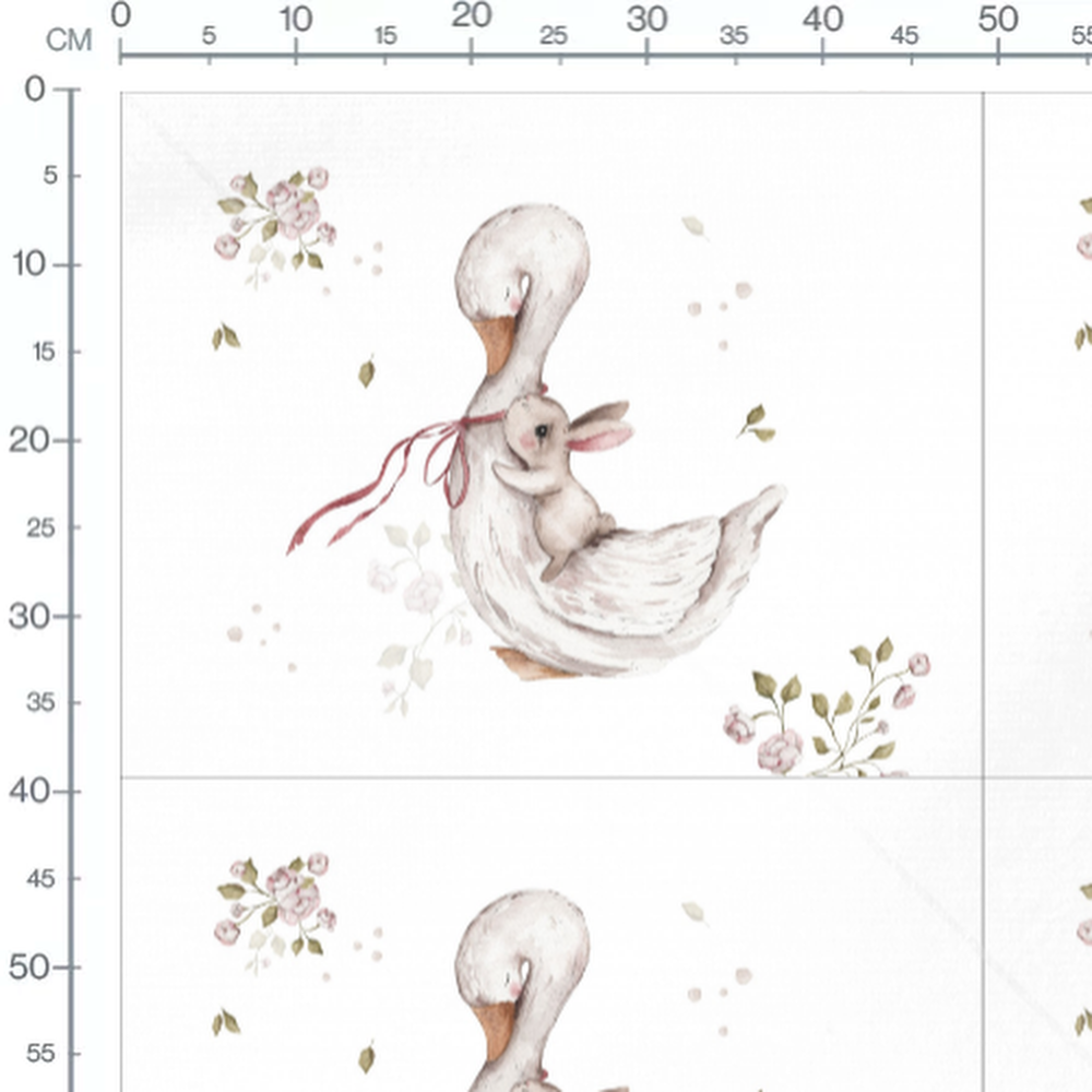 Le canard porte un ruban rouge autour du cou. Le lapin est blotti contre le canard. Petites fleurs roses et feuilles vertes décorent le fond.Les tissus