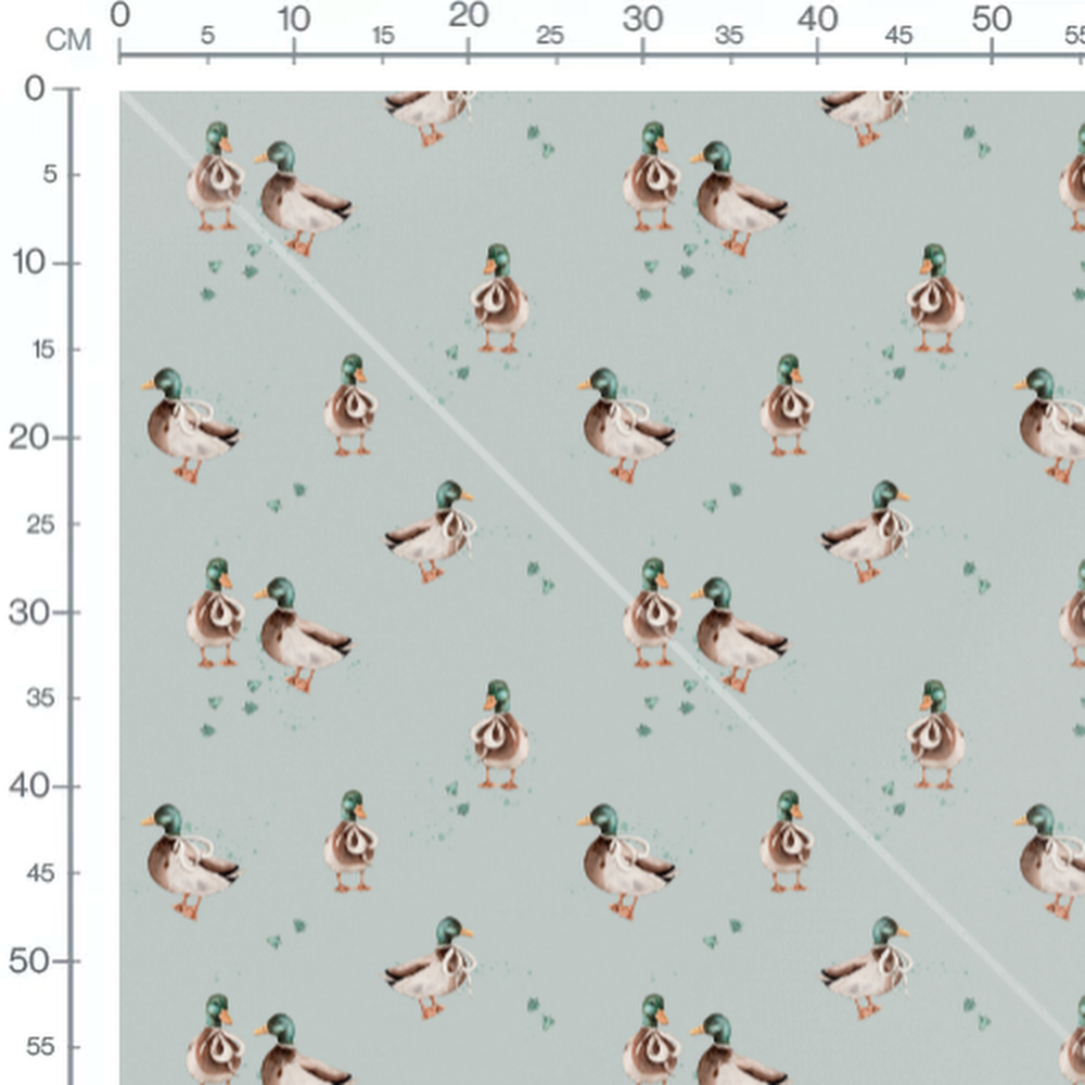 Les canards ont des plumes brunes et des têtes vertes. Le fond bleu clair est parsemé de petites feuilles vertes. Les rubans blancs ajoutent une touche décorative aux canards.Les tissus