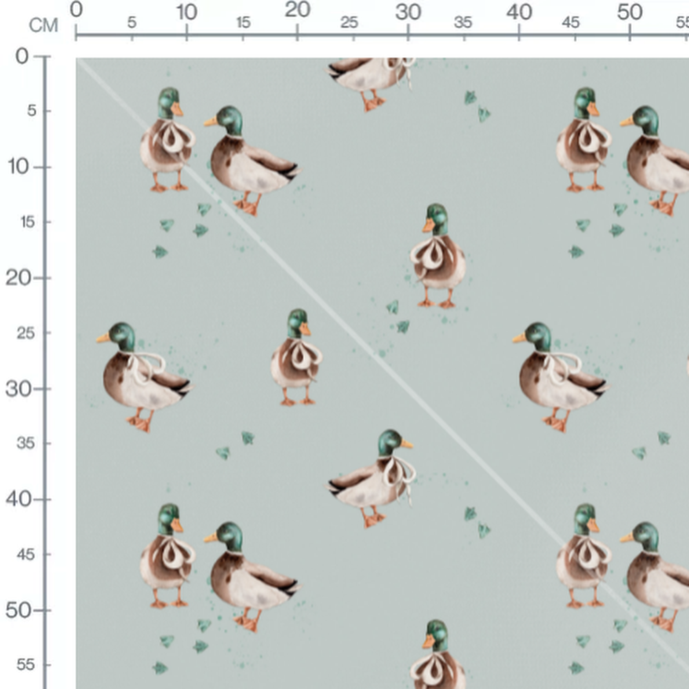 Les canards ont des plumes brunes et des têtes vertes. Les nœuds blancs autour de leur cou ajoutent une touche charmante. Le fond gris est parsemé de petites éclaboussures vertes.Les tissus