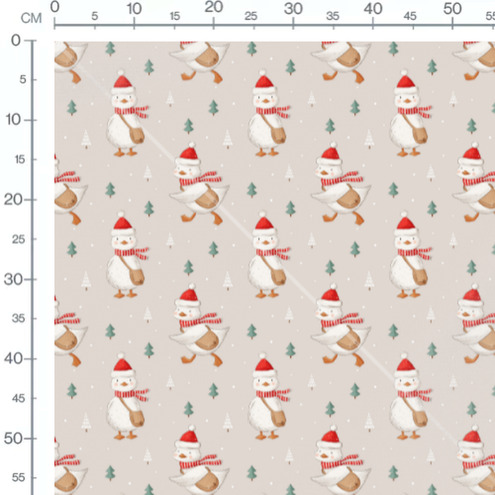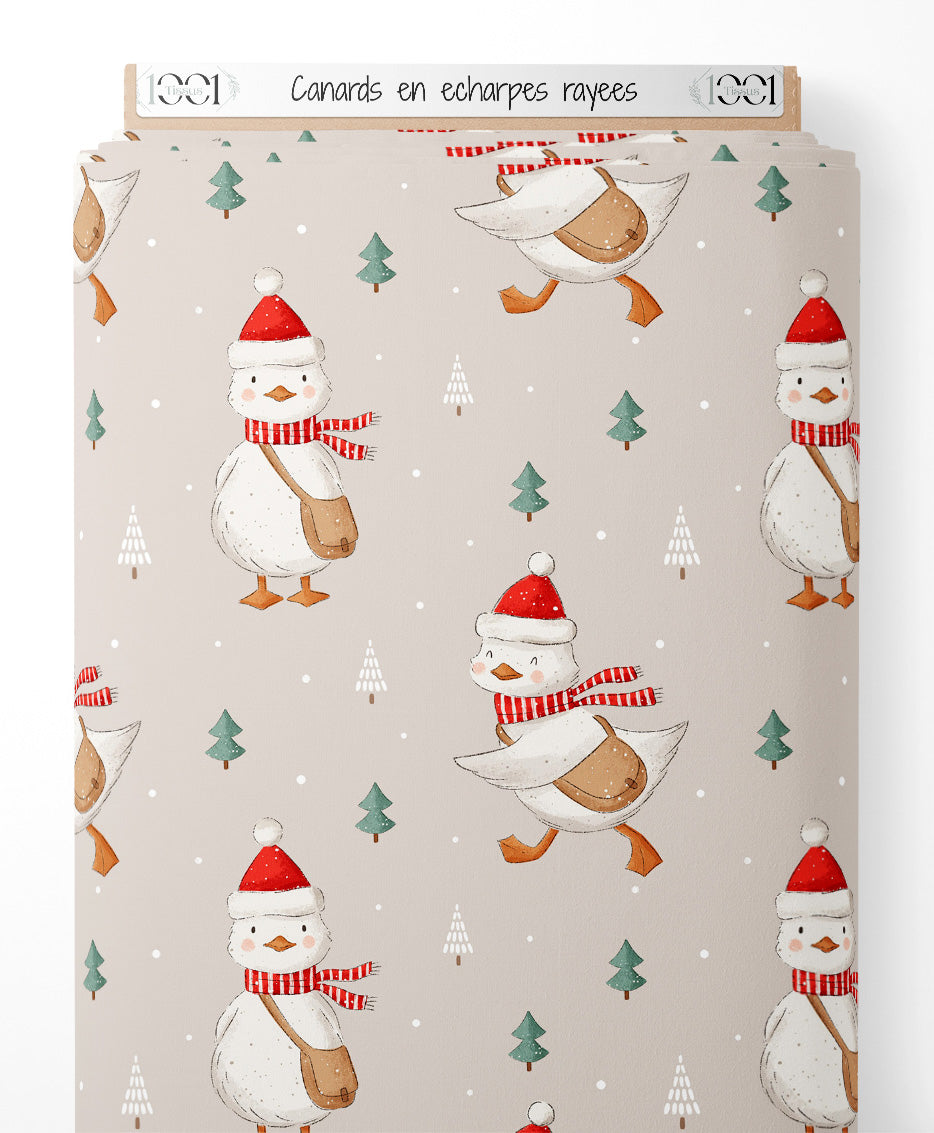 Les canards portent des bonnets rouges à pompon et des écharpes rayées rouges et blanches. Chaque canard a un petit sac marron en bandoulière. De petits sapins verts et blancs sont éparpillés sur le fond beige. De petits points blancs évoquent la neige tombante.Les tissus