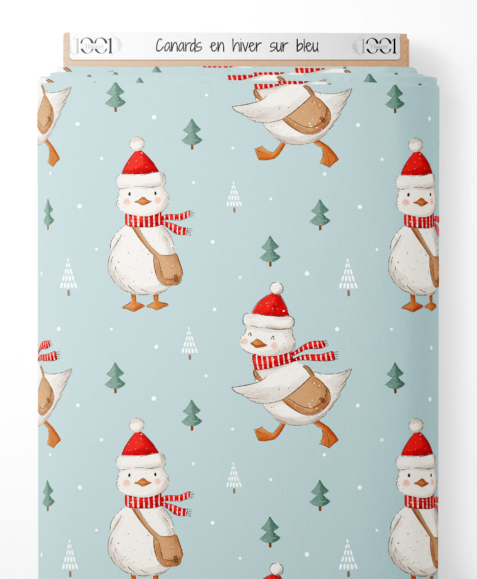 Les canards portent des bonnets rouges à pompon et des écharpes rayées rouges et blanches. Ils ont également une sacoche marron. De petits sapins verts et des flocons blancs complètent le motif hivernal.Les tissus