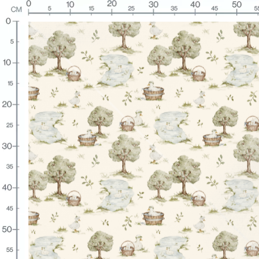 Les canards sont parfois dans des paniers en osier ou des baignoires en bois. Les arbres sont feuillus avec des nuances de vert et brun. Le ruisseau serpente à travers le motif, ajoutant une touche de bleu clair. Quelques petites branches avec feuilles vertes parsèment le fond.Les tissus