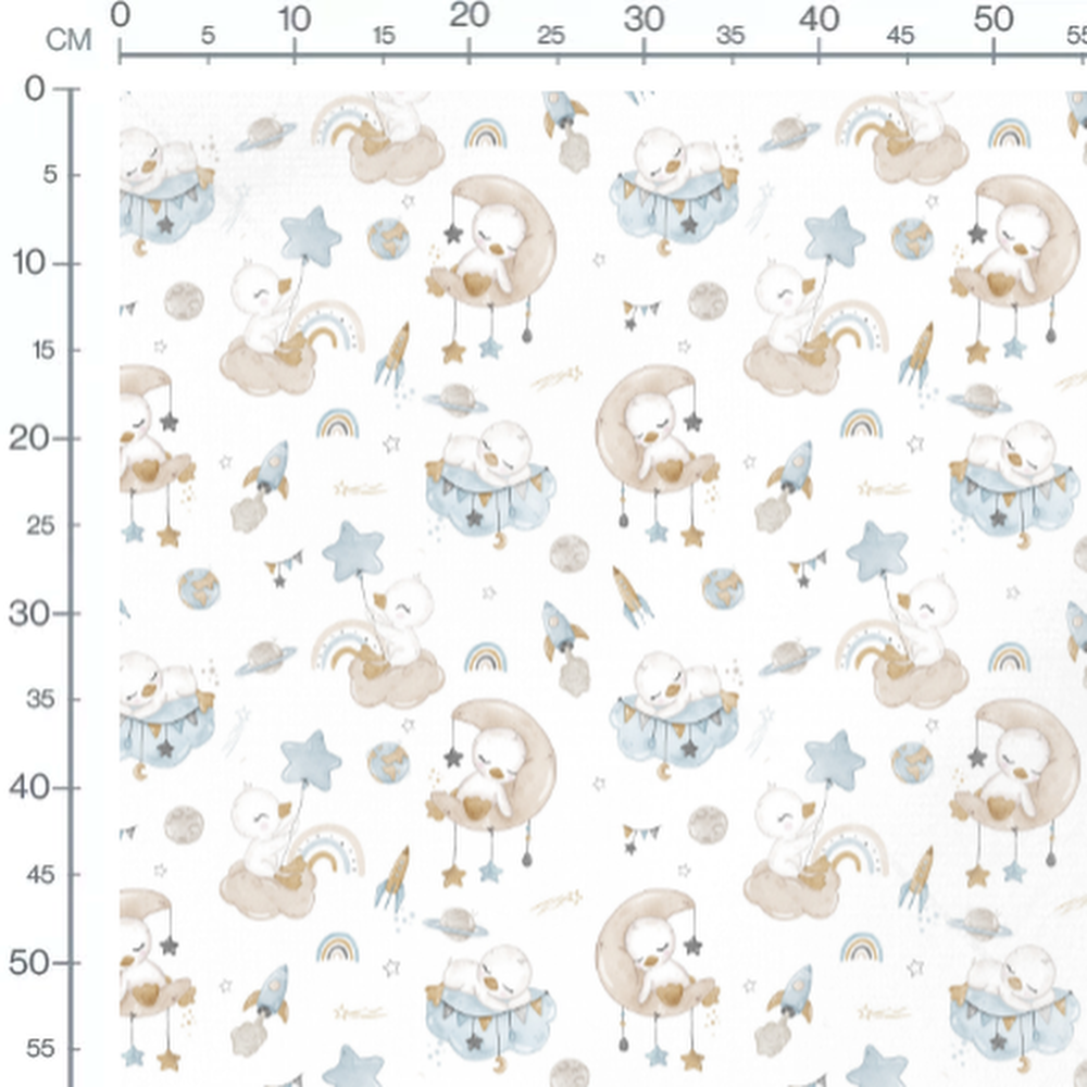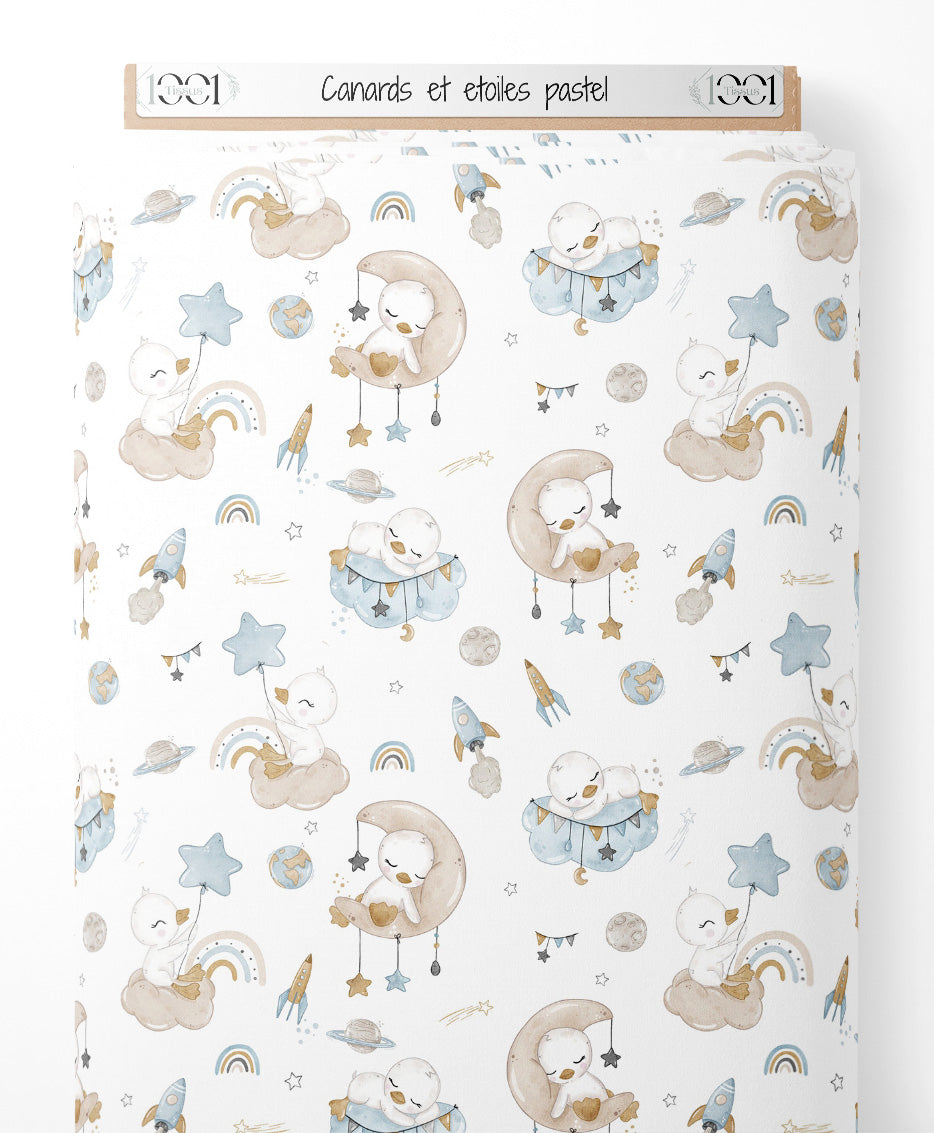 Arc-en-ciel pastel et planètes grises complètent le motif. Petites étoiles noires dispersées sur le fond. Guirlandes de fanions beige et bleu ajoutent une touche festive.Les tissus