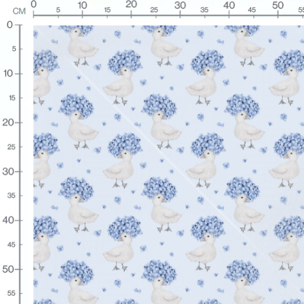 Les canards portent des bouquets de fleurs bleues sur la tête. Les petites fleurs bleues ajoutent une touche délicate au motif.Les tissus