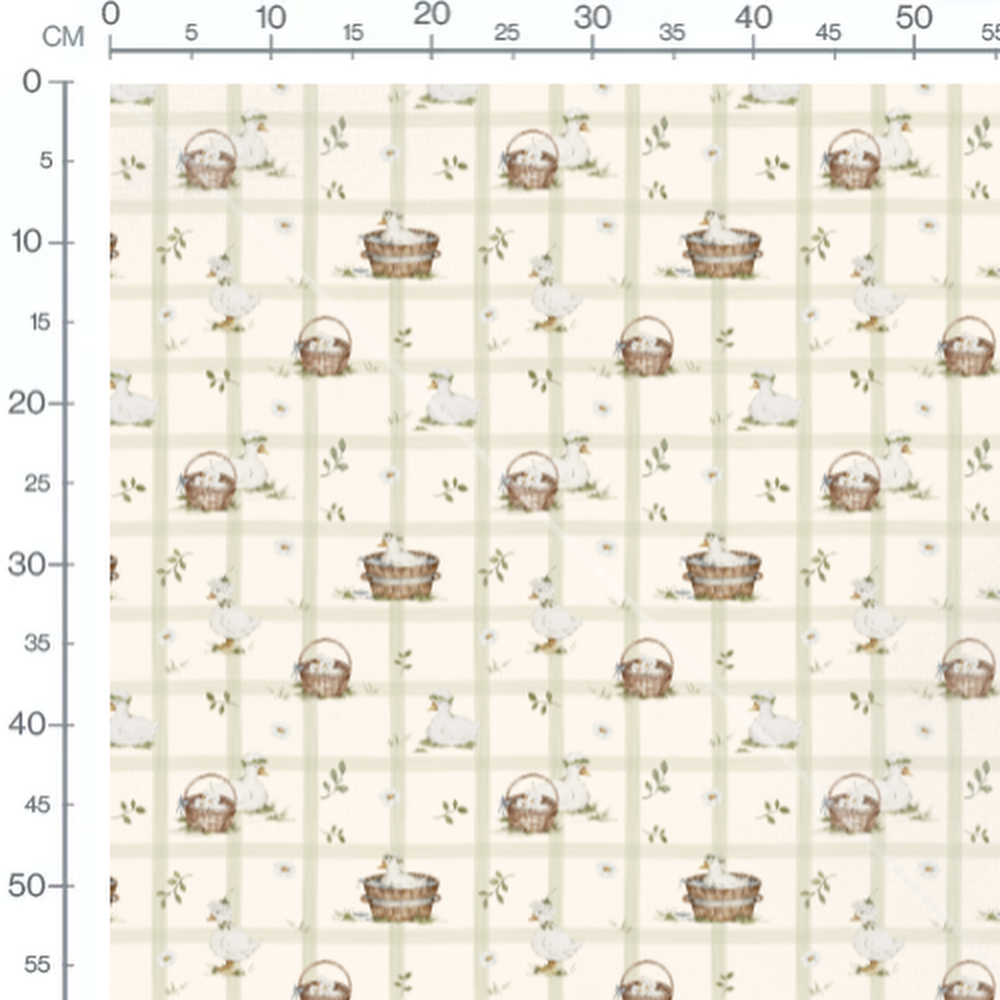 Les canards sont accompagnés de paniers en osier contenant des fleurs. Des motifs de feuillages verts et de petites fleurs blanches ajoutent une touche champêtre. Le fond à carreaux beige crée une ambiance douce et naturelle.Les tissus