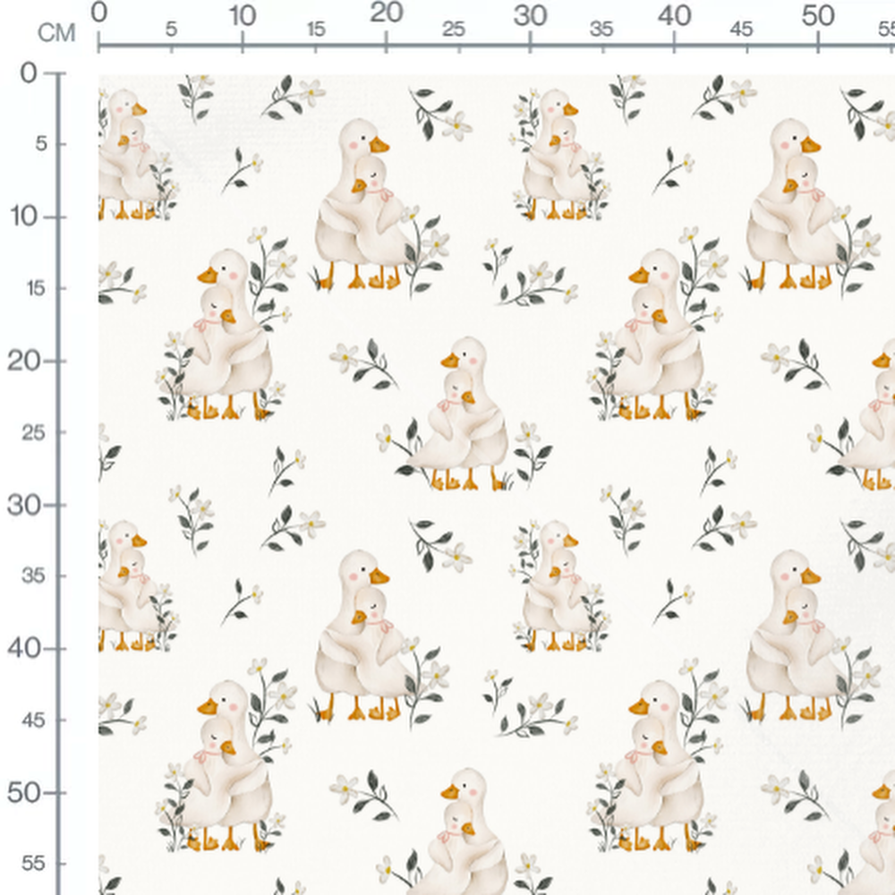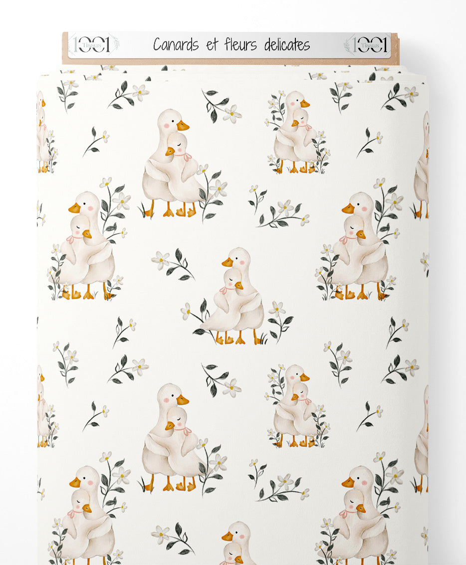 Les canards sont dessinés avec des détails doux et portent des rubans roses. Les fleurs blanches ajoutent une touche délicate au motif. Les feuilles noires contrastent subtilement avec le fond clair.Les tissus