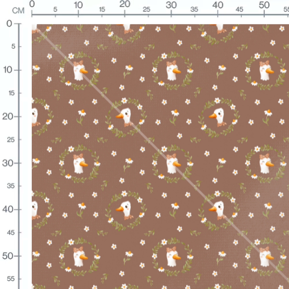 Les canards portent des nœuds papillon à motifs. Les couronnes de feuilles sont composées de petites feuilles vertes. Les fleurs blanches sont simples et petites, ajoutant une touche délicate au motif.Les tissus