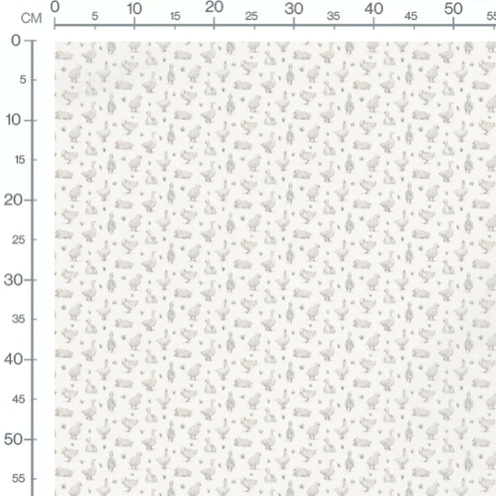 Les canards sont dessinés dans des tons de gris et blanc avec des détails subtils. Les herbes vertes ajoutent une touche de couleur au motif. Chaque canard est représenté dans une pose différente, apportant de la variété au design.Les tissus