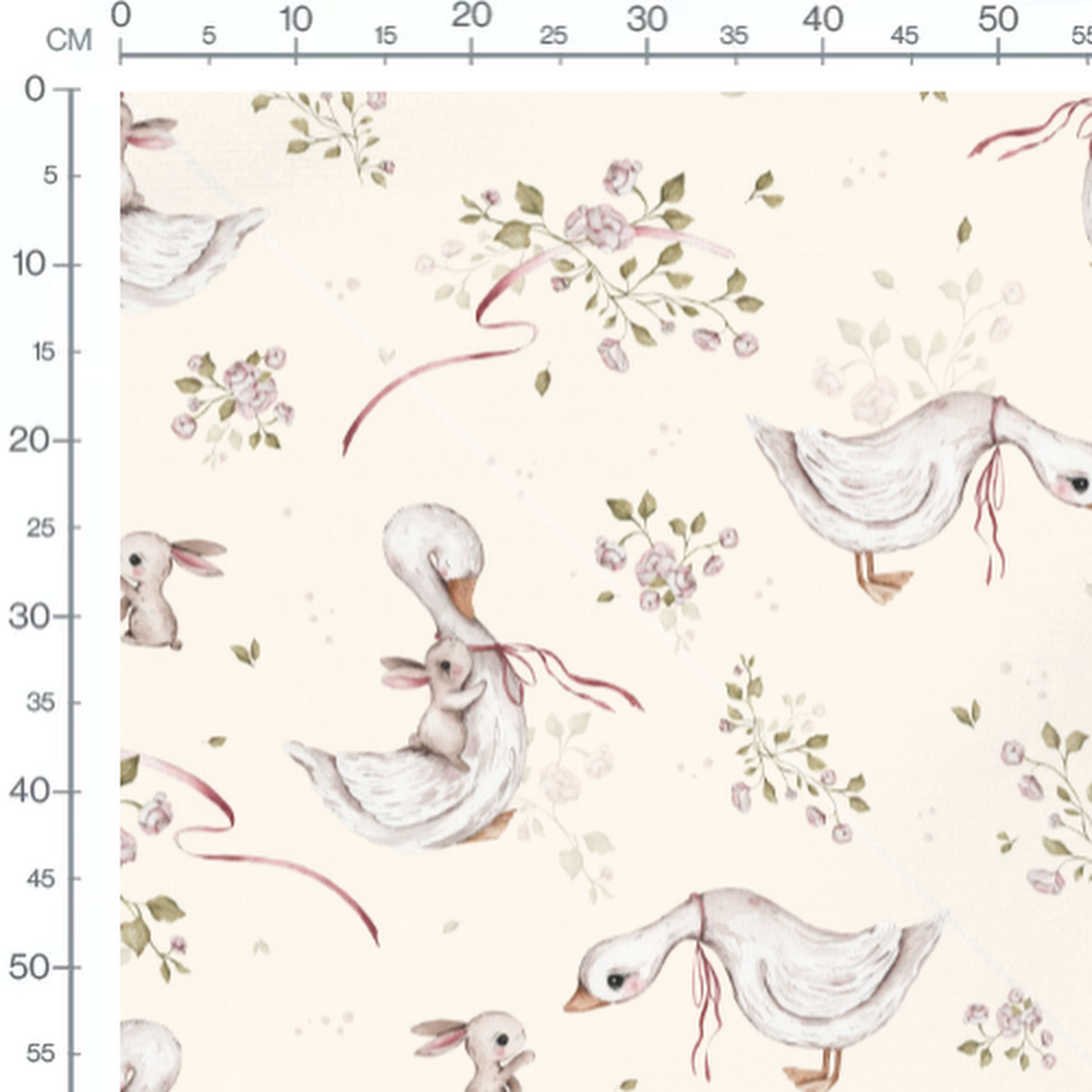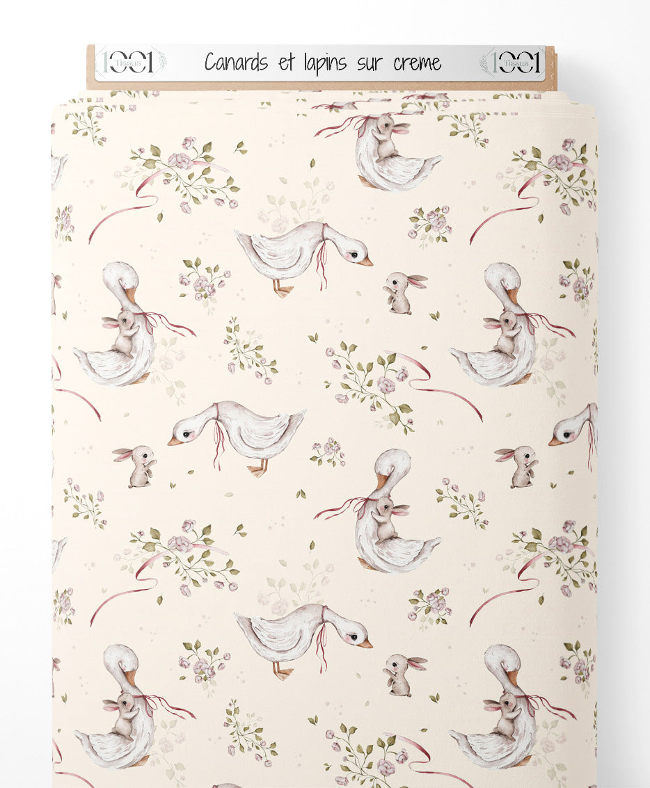 Les canards sont illustrés avec des rubans rouges autour du cou. Les lapins sont assis à côté des canards. Des fleurs roses et des feuillages verts ajoutent une touche délicate au motif.Les tissus