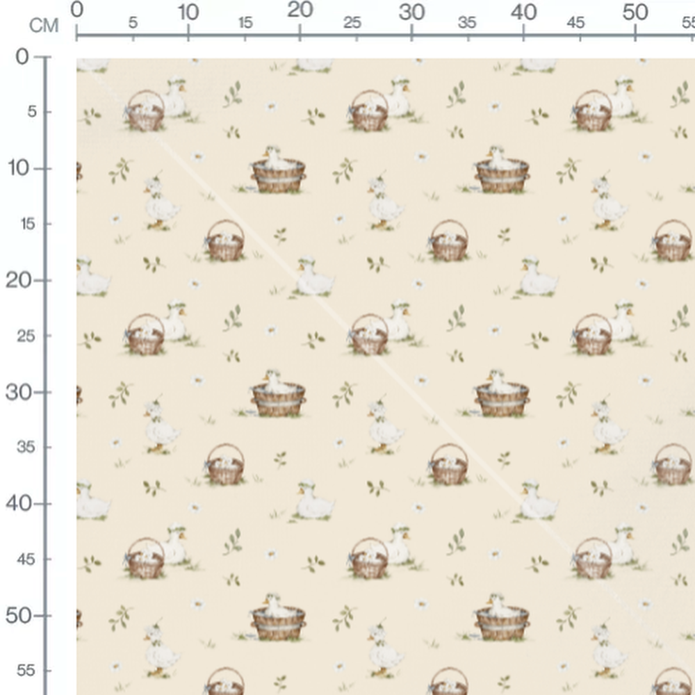 Les canards sont accompagnés de paniers en osier. Quelques fleurs blanches et des feuilles vertes ajoutent une touche naturelle.Les tissus