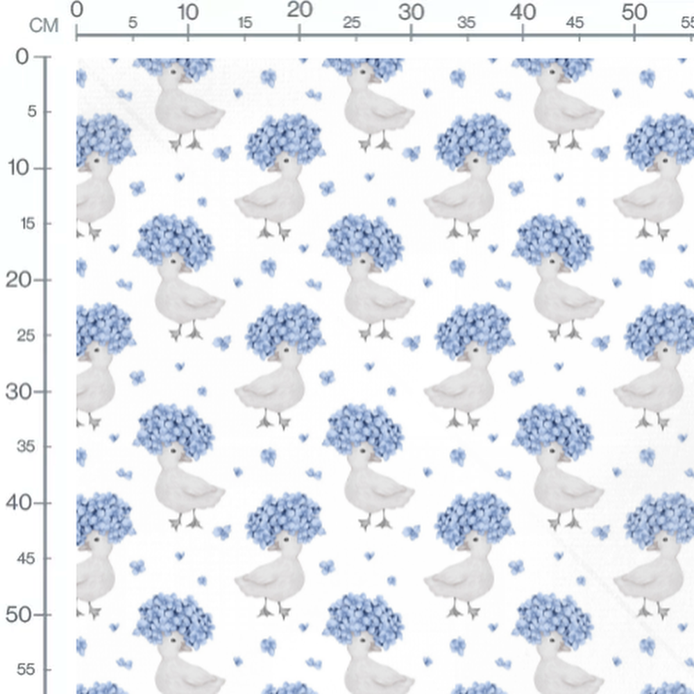 Les canards ont des bouquets de fleurs bleues sur la tête. De petites fleurs bleues sont éparpillées entre les canards.Les tissus
