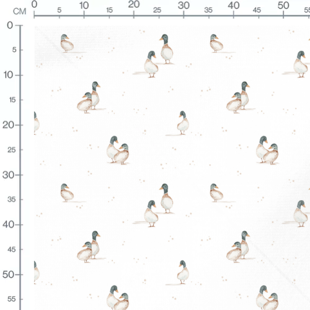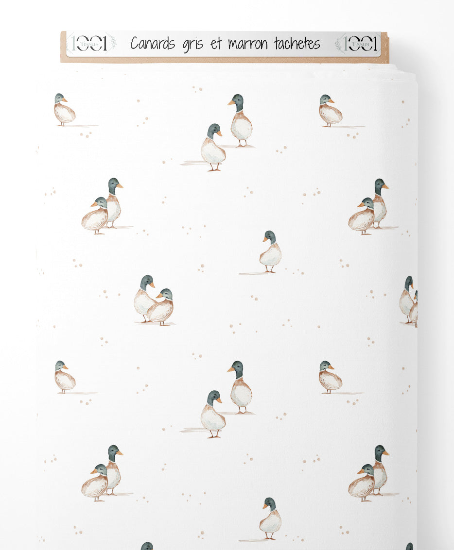 Les canards sont dessinés avec des nuances de gris et de marron. Le fond blanc est parsemé de petites taches beige, ajoutant un effet aquarelle subtil.Les tissus