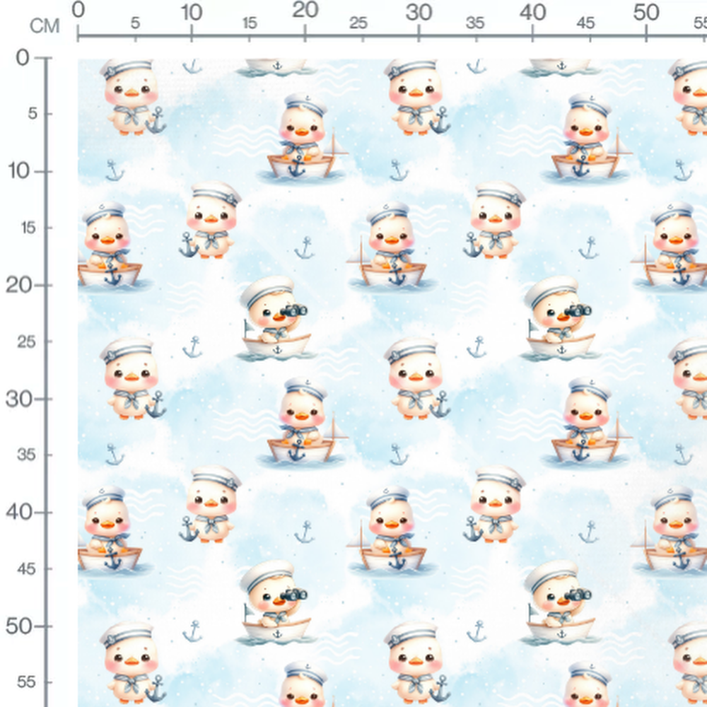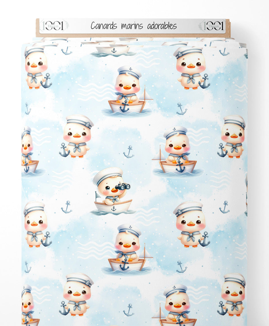 Les canards portent des chapeaux de marin et tiennent des ancres. Des petits bateaux en bois naviguent sur le fond bleu clair. Des jumelles et des motifs marins ajoutent une touche nautique.Les tissus