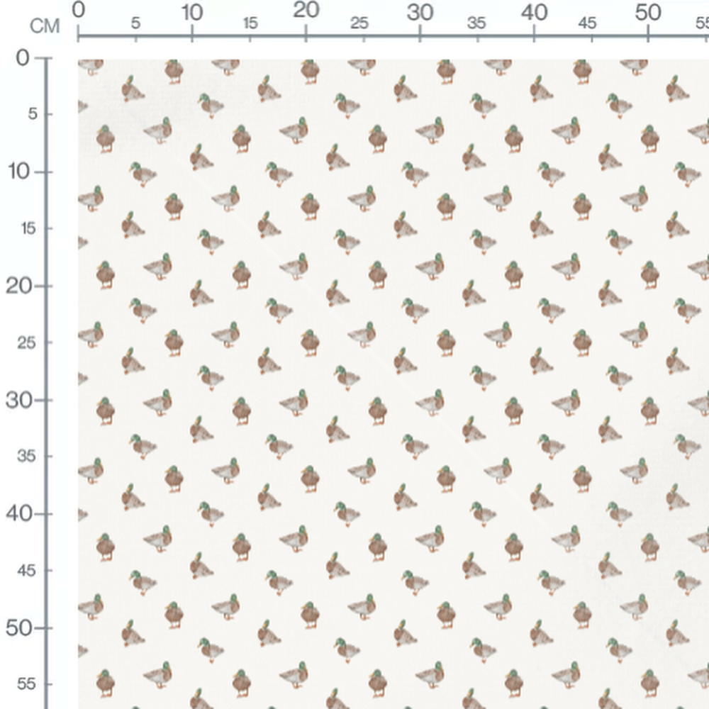 Les canards présentent des teintes marron et vert avec des détails réalistes. Le fond blanc met en valeur les couleurs douces des plumes. Chaque canard est dessiné avec une touche aquarelle, ajoutant une dimension artistique au motif.Les tissus