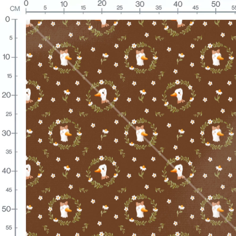 Les canards portent des nœuds roses et sont entourés de couronnes de feuilles vertes. De petites fleurs blanches avec des centres orange parsèment le fond brun. Les motifs sont répétés de manière uniforme sur l'ensemble du tissu.Les tissus