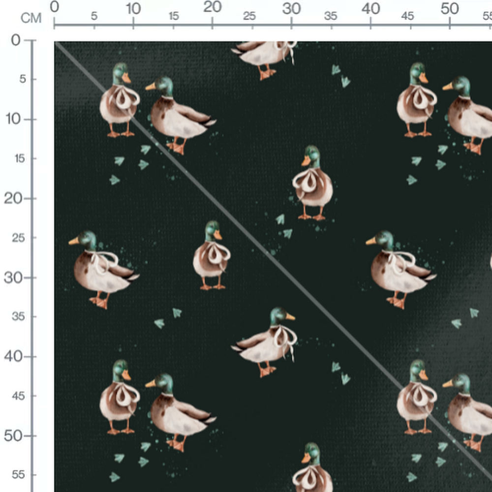 Les canards sont représentés avec des rubans blancs autour du cou. Le fond noir met en valeur les empreintes de pas vertes dispersées.Les tissus