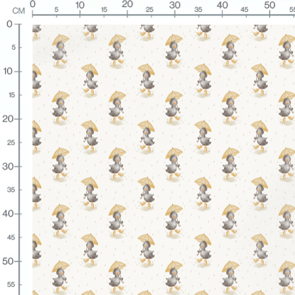 Les canards portent des bottes jaunes assorties à leurs parapluies. Le fond blanc met en valeur les nuances de gris des canards. Les gouttes de pluie ajoutent une touche ludique au motif.Les tissus