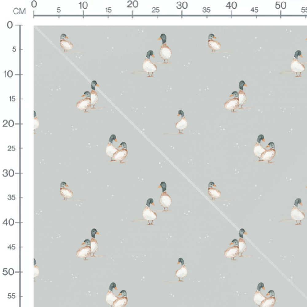 Les canards sont dessinés avec des détails subtils. Le fond gris est parsemé de petites taches blanches, ajoutant une touche de douceur au motif.Les tissus