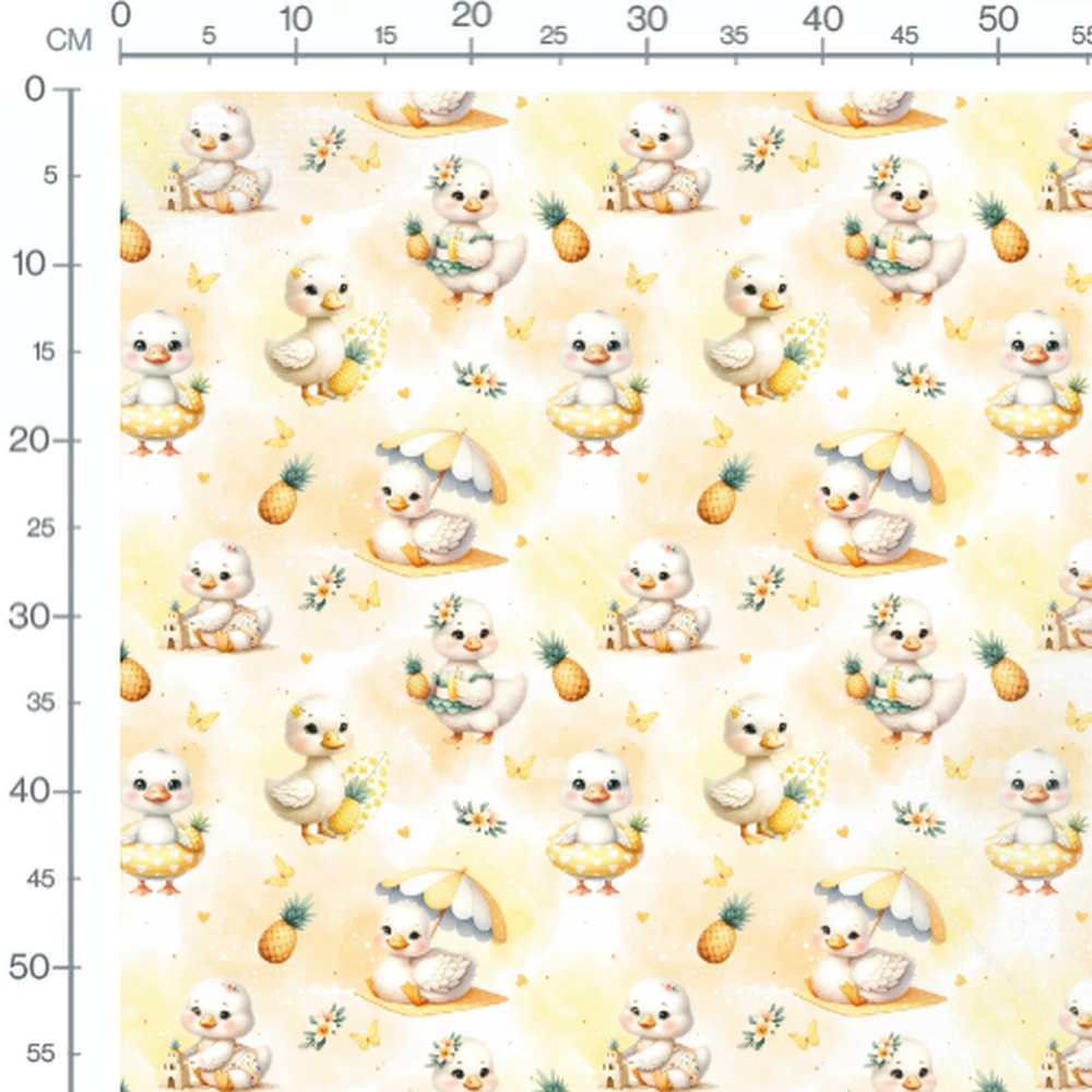 Les canetons portent des vêtements et jouent avec des objets estivaux. Des ananas et des fleurs complètent le motif. Des papillons jaunes ajoutent une touche de légèreté.Les tissus