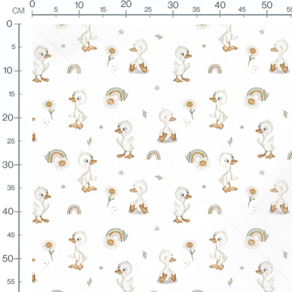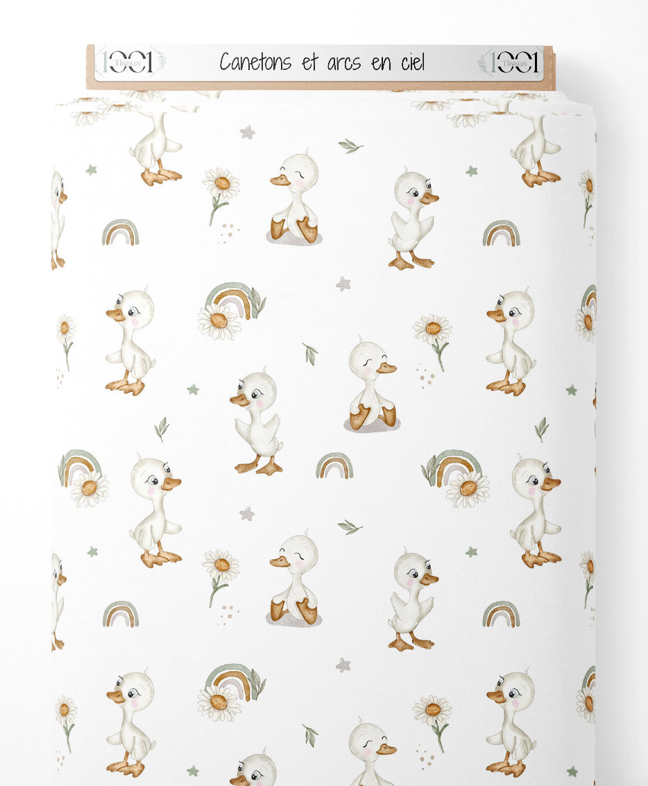 Les canetons sont accompagnés de marguerites aux pétales blanches et cœurs jaunes. De petits arcs-en-ciel aux teintes douces ajoutent une touche colorée. Des étoiles grises et des feuilles vertes complètent le motif.Les tissus