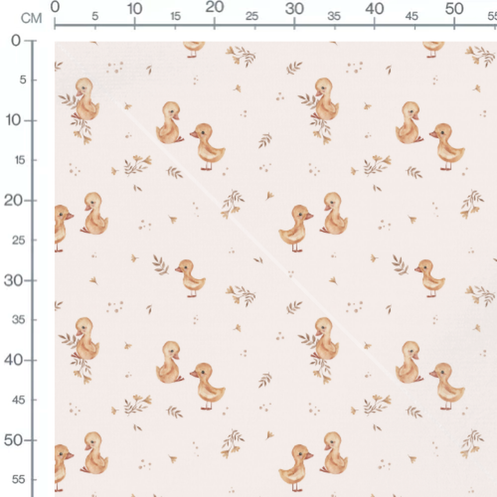 Les canetons sont dessinés dans des teintes douces de beige. Les feuillages ajoutent une touche naturelle avec leurs nuances brunes.Les tissus