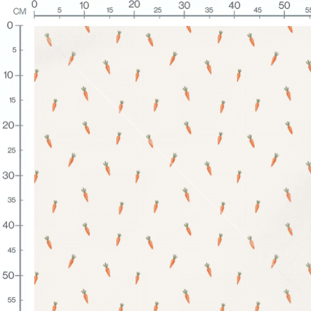 Les carottes sont de taille moyenne et de couleur orange vif. Les fanes sont d'un vert doux, ajoutant une touche naturelle au motif.Les tissus