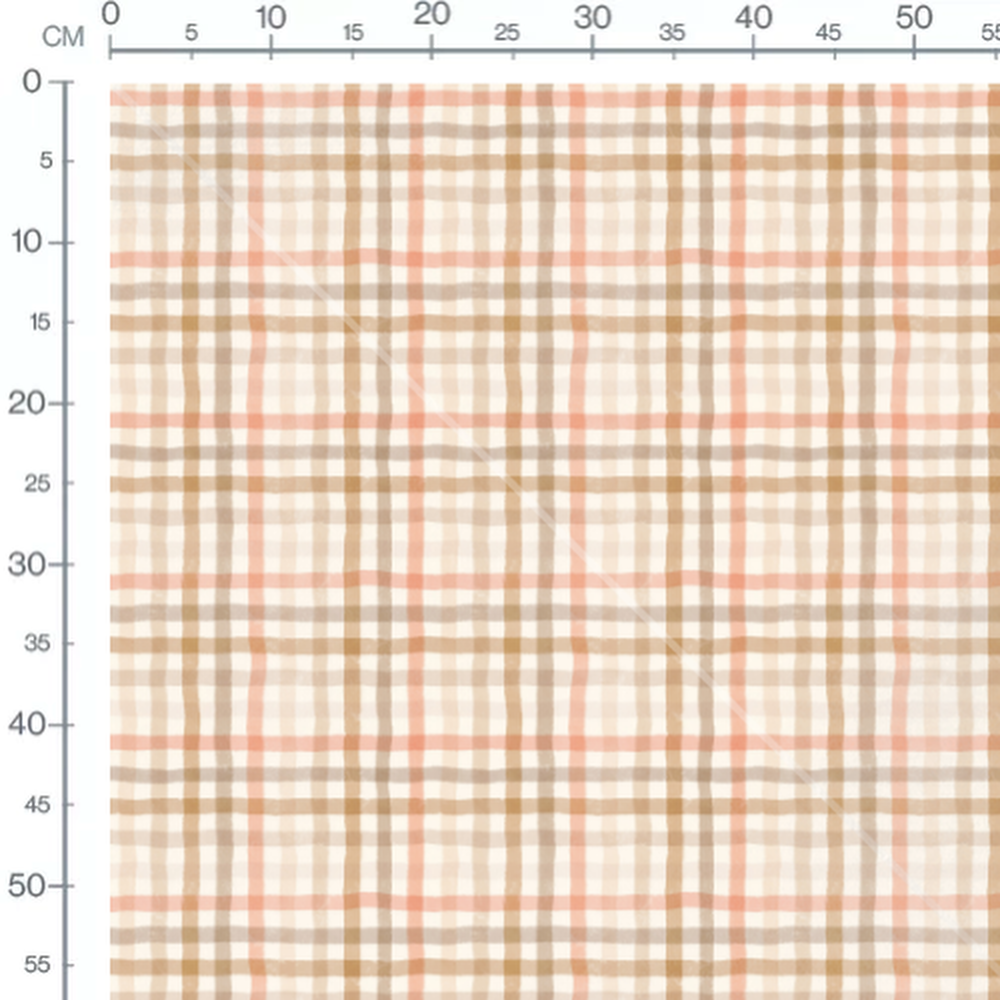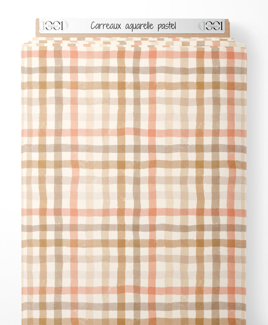 Les carreaux sont formés par des lignes aquarelle dans des tons doux. Les couleurs incluent des nuances de beige, rose et crème.Les tissus