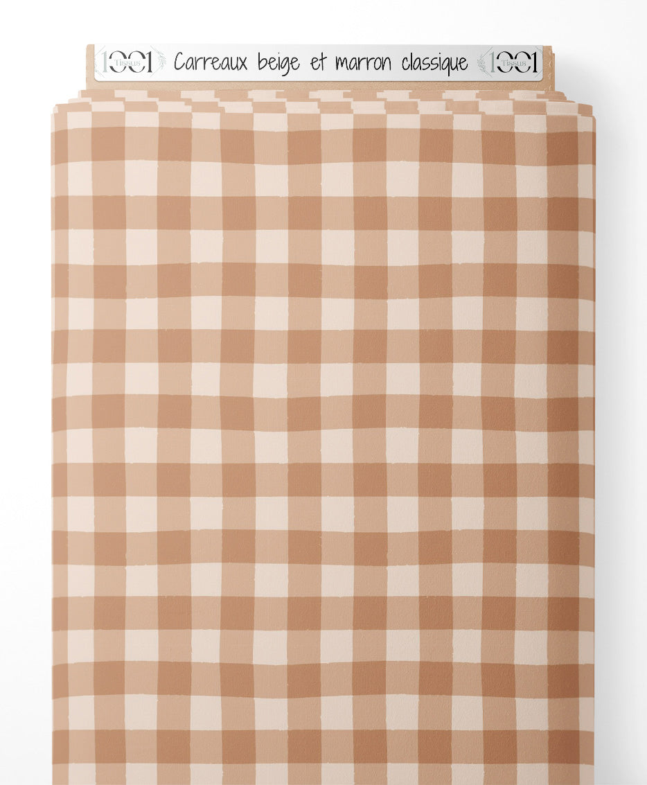Les carreaux sont de taille uniforme et alternent entre beige et marron. Le fond beige met en valeur le motif géométrique classique.Les tissus