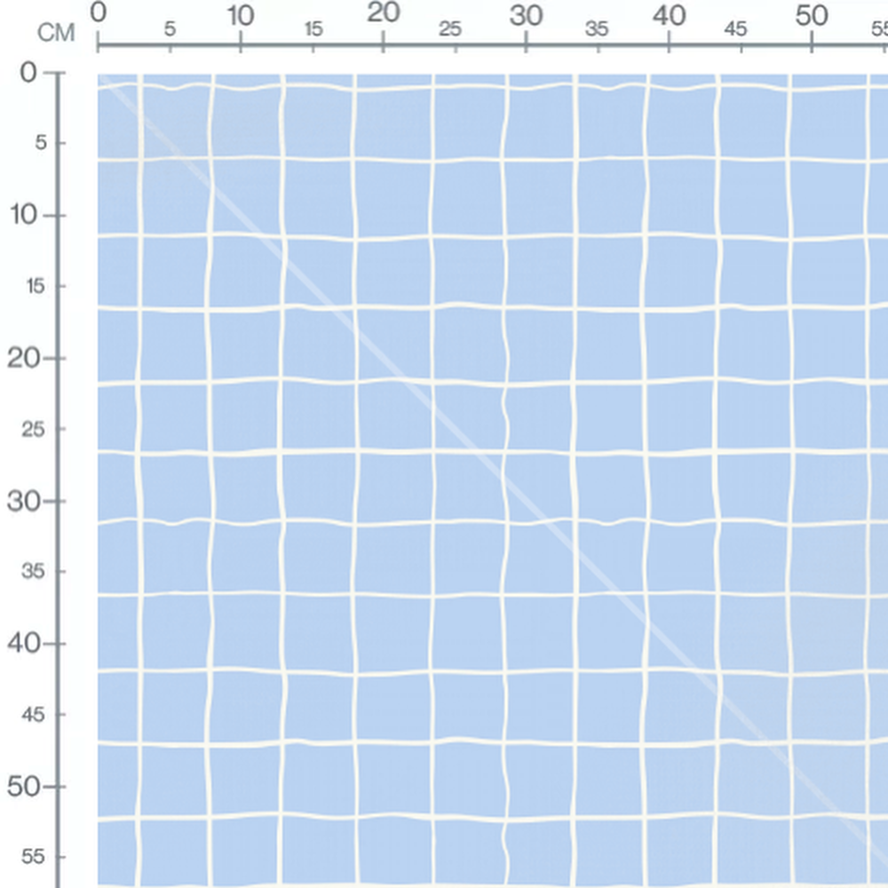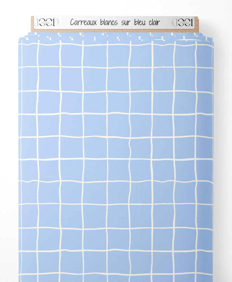 Carreaux blancs irréguliers sur fond bleu clair. Lignes blanches formant un motif de grille.Les tissus
