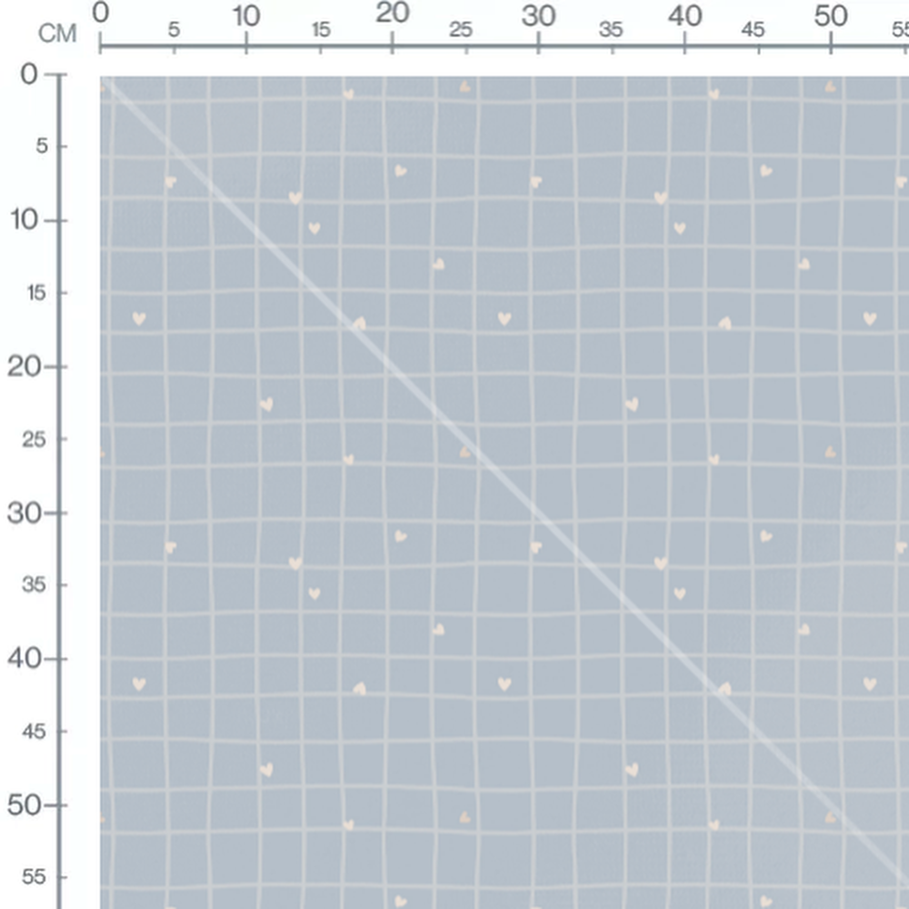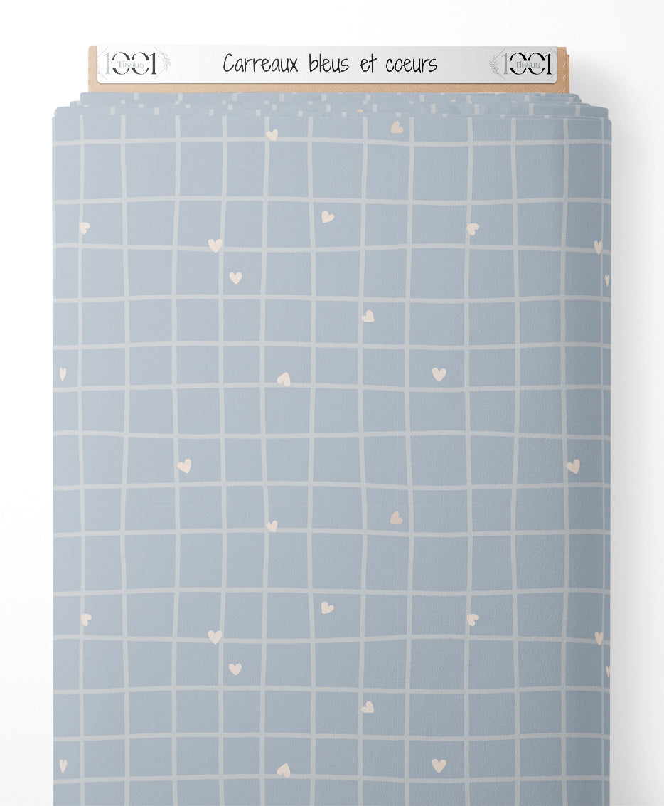 Les cœurs blancs sont dispersés sur une grille de carreaux bleus clairs. Le motif combine des éléments géométriques et des symboles doux.Les tissus