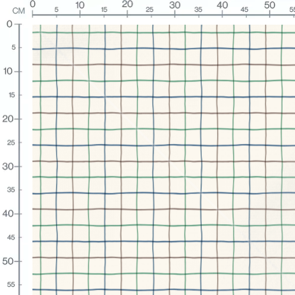 Carreaux bleus, verts et marron sur fond beige. Lignes fines et régulières formant un motif quadrillé.Les tissus