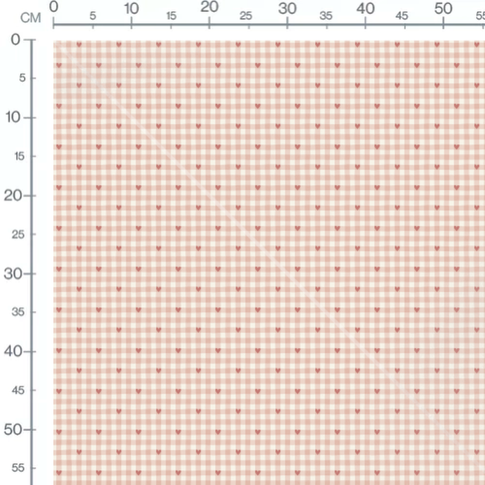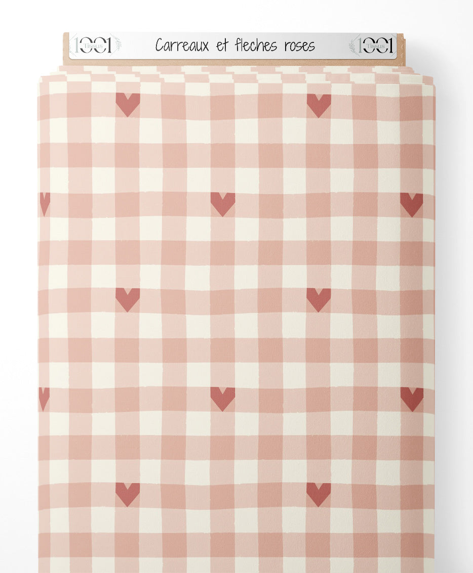 Les carreaux alternent entre des teintes de rose et de blanc. Des flèches roses sont dispersées sur le motif.Les tissus