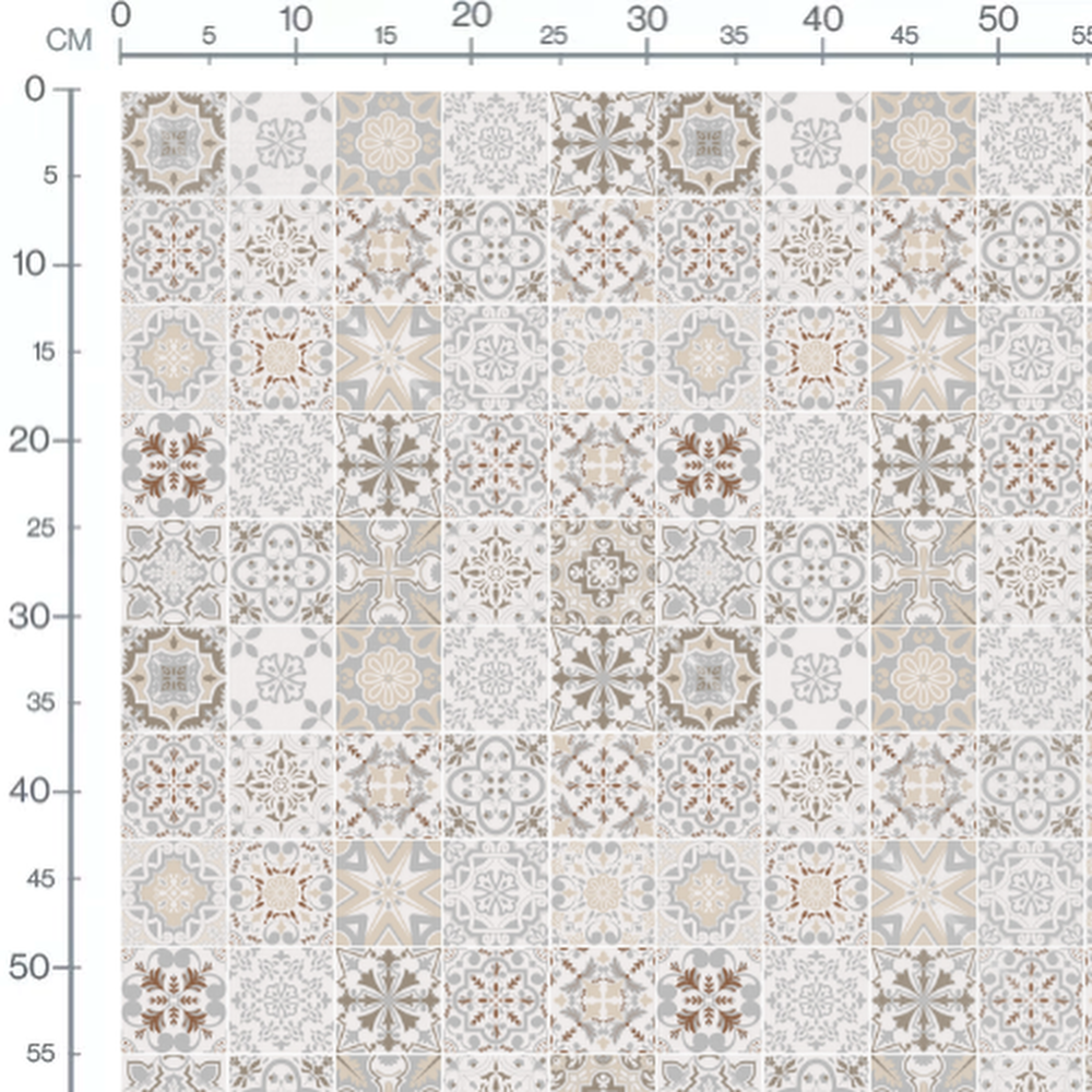 Les motifs incluent des formes étoilées et des arabesques. Les couleurs dominantes sont le beige, le gris et le blanc. Chaque carreau présente un design unique avec des éléments floraux stylisés. Les motifs sont symétriques et variés.Les tissus