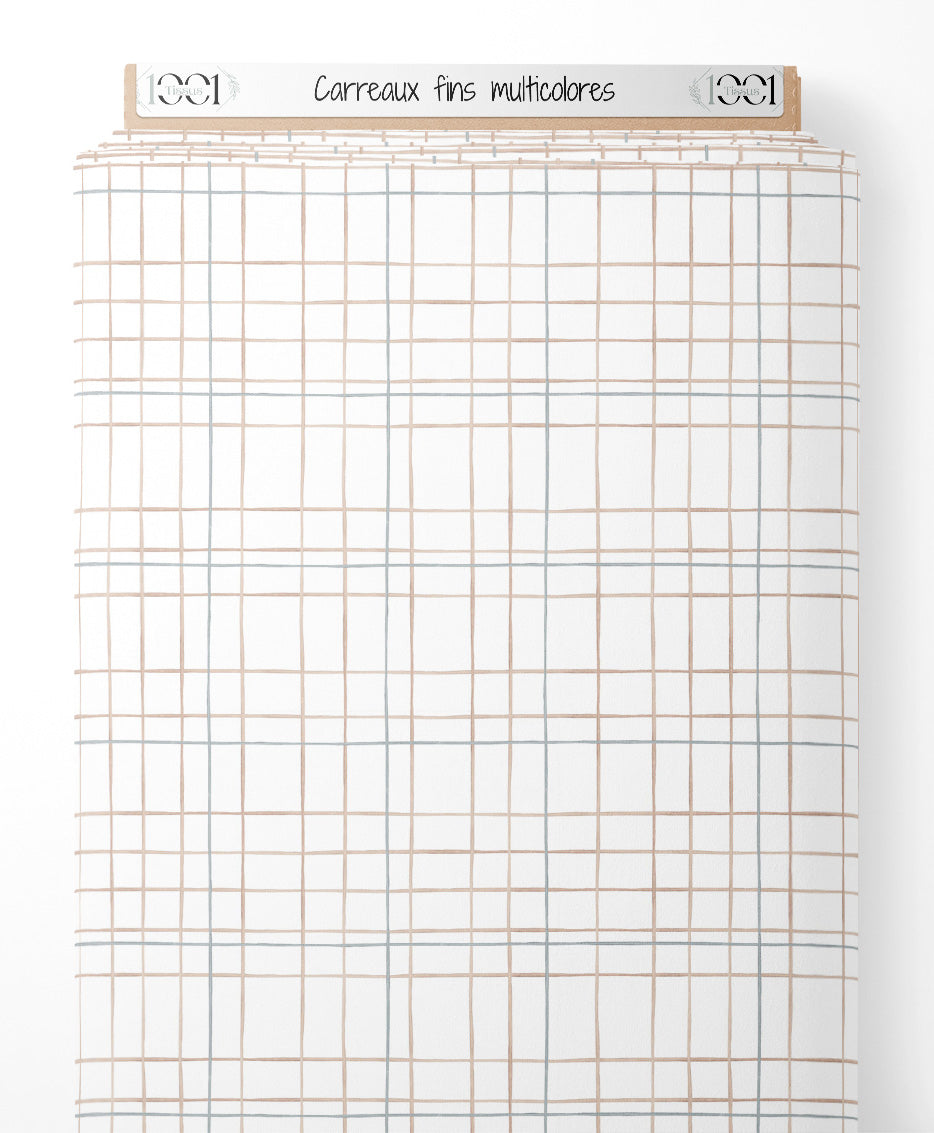 Les lignes sont de différentes épaisseurs et couleurs. Le motif est régulier et symétrique. Les couleurs sont douces et neutres.Les tissus