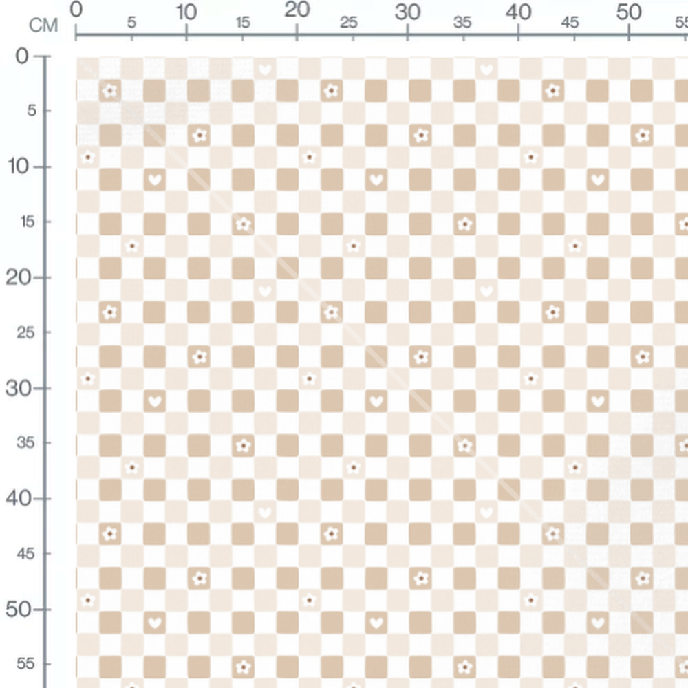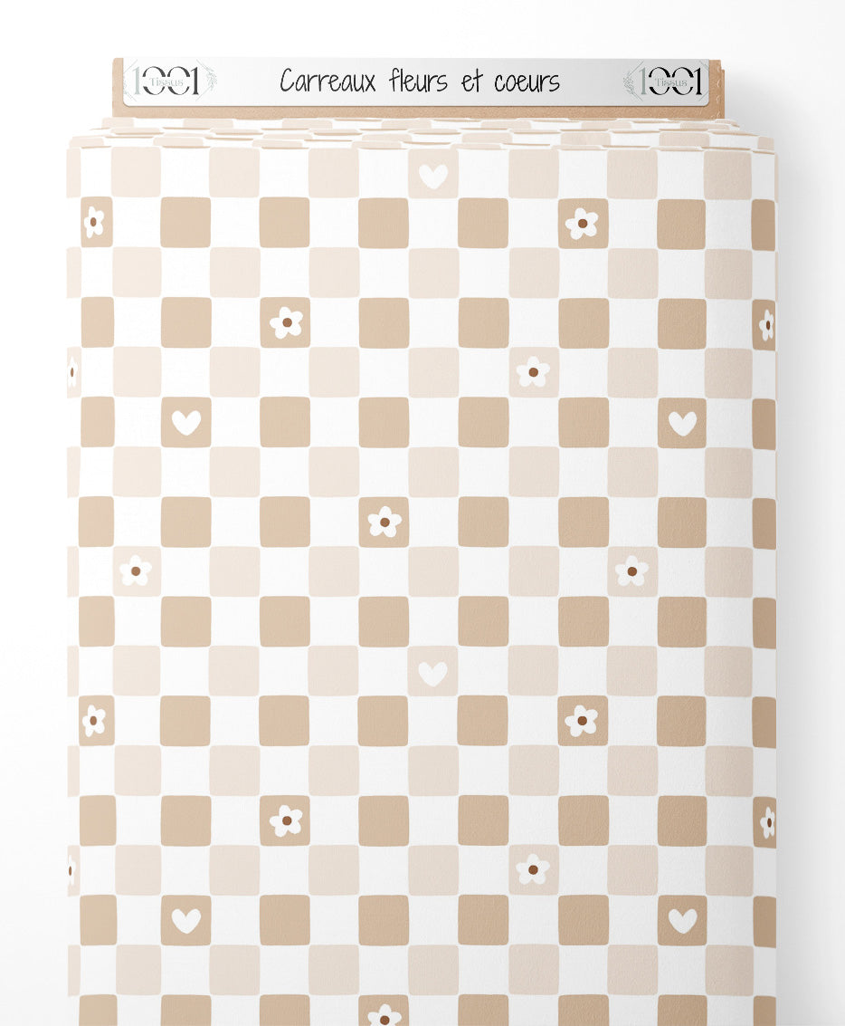 Les fleurs blanches sont dispersées parmi les carreaux. Les cœurs ajoutent une touche douce au motif.Les tissus