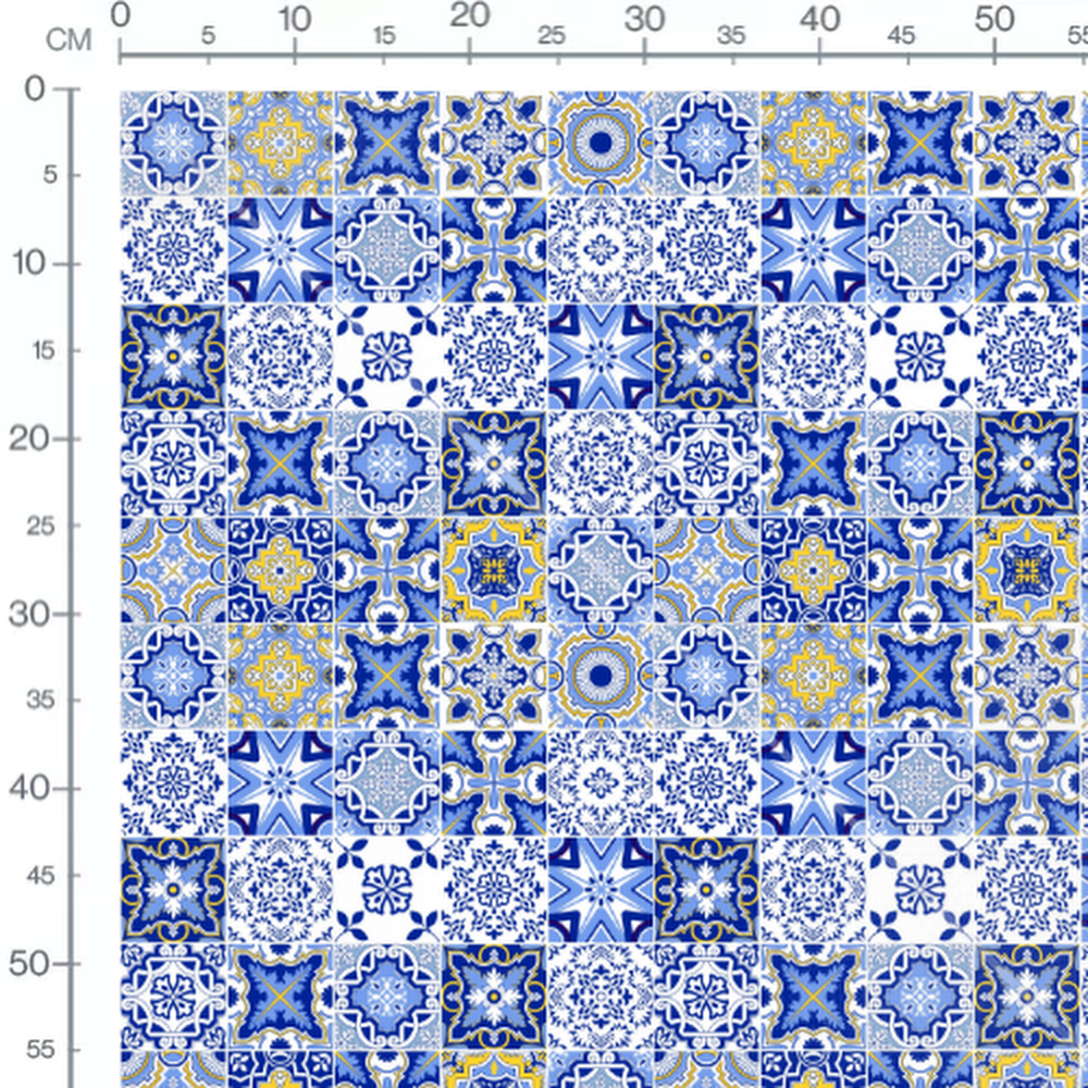 Les motifs incluent des formes étoilées et des arabesques complexes. Les couleurs dominantes sont le bleu, le jaune et le blanc. Chaque carreau présente un design unique avec des éléments floraux stylisés.Les tissus