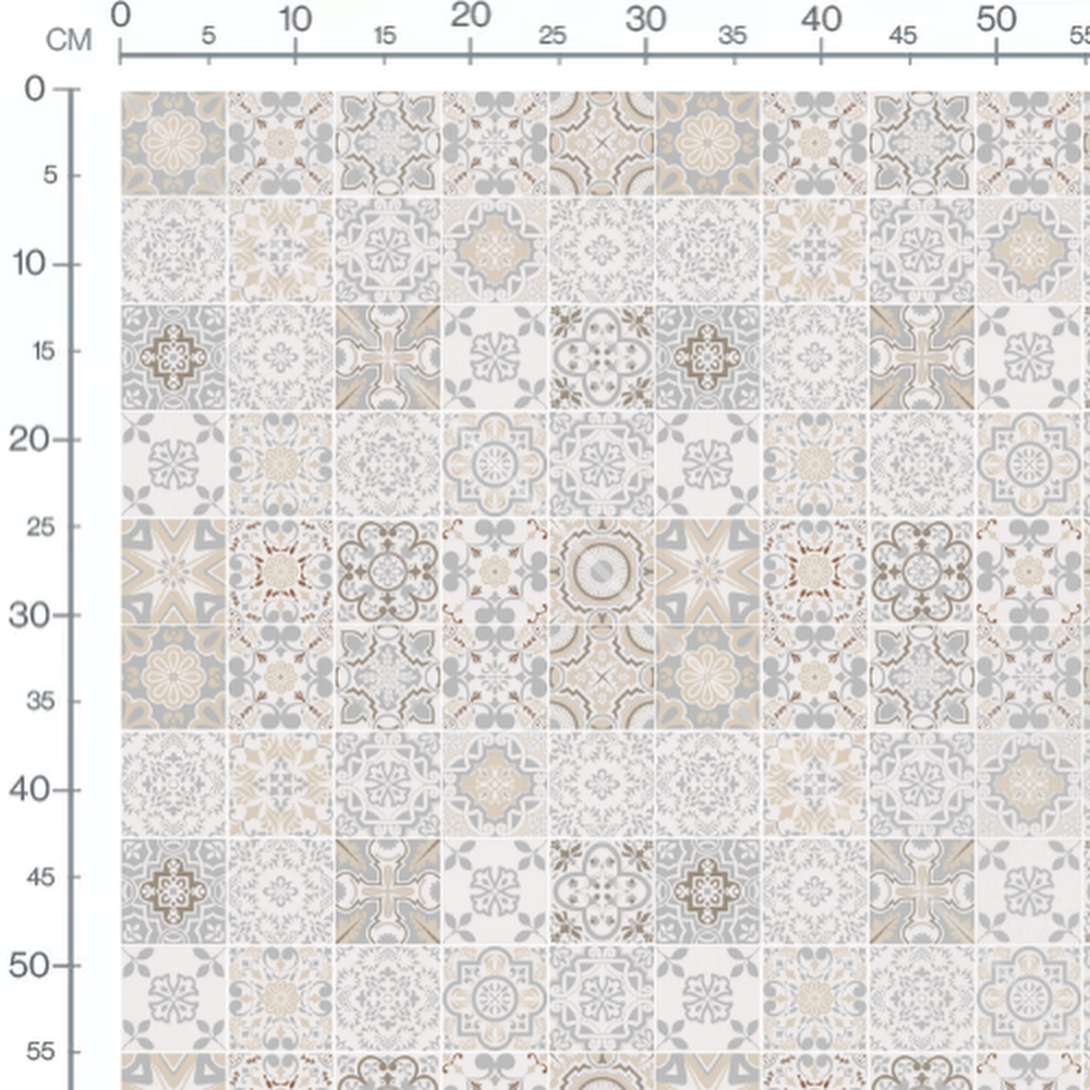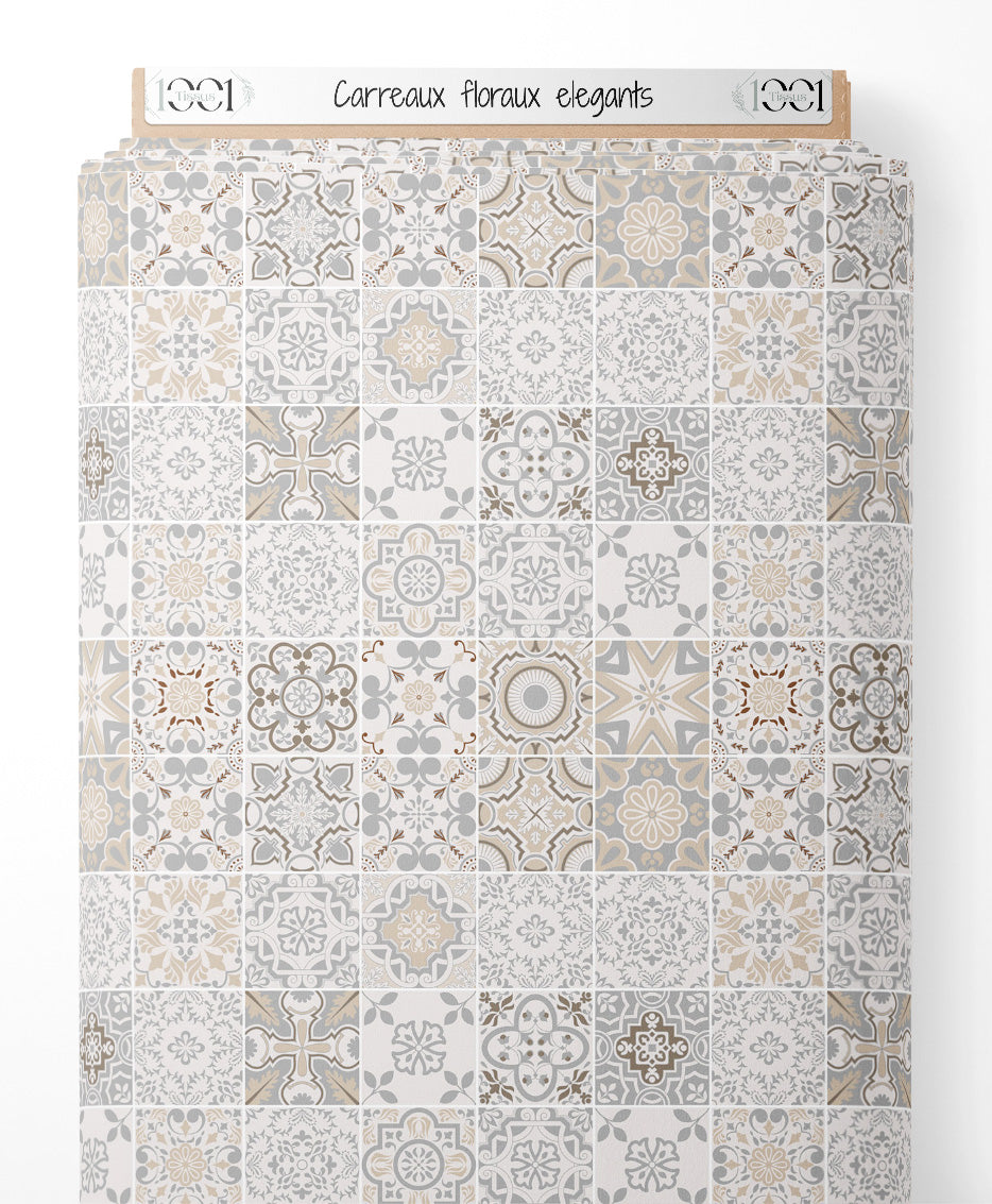 Les motifs incluent des formes florales et des arabesques en nuances de beige et gris. Chaque carreau présente un design unique combinant des éléments géométriques et floraux. Les couleurs neutres créent un ensemble harmonieux et élégant. Les motifs sont variés, allant de simples formes géométriques à des dessins plus complexes.Les tissus