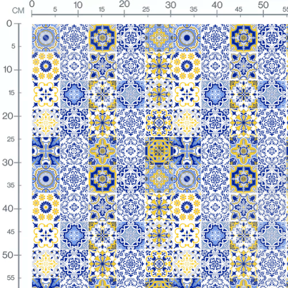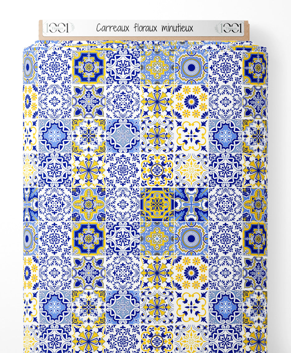 Les motifs incluent des formes florales et des arabesques complexes. Les couleurs principales sont le bleu cobalt et le jaune vif. Chaque carreau présente un design unique avec des éléments répétitifs. Les motifs sont inspirés de l'art traditionnel portugais. Les détails sont fins et minutieux, créant un effet visuel riche.Les tissus