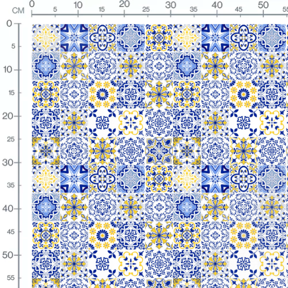 Les motifs incluent des formes florales et des arabesques. Les couleurs principales sont le bleu, le jaune et le blanc. Chaque carreau présente un design unique avec des éléments répétitifs. Les motifs sont inspirés des mosaïques traditionnelles. Les détails sont fins et complexes, créant un effet visuel riche.Les tissus