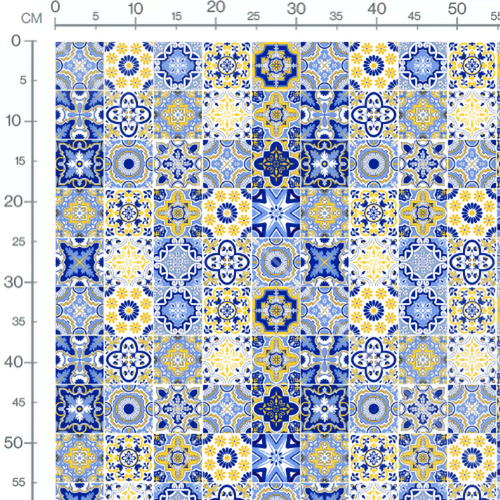 Les motifs incluent des fleurs stylisées et des arabesques complexes. Les couleurs principales sont le bleu, le jaune et le blanc. Chaque carreau présente un design unique avec des formes symétriques. Les éléments floraux sont entourés de motifs géométriques variés.Les tissus