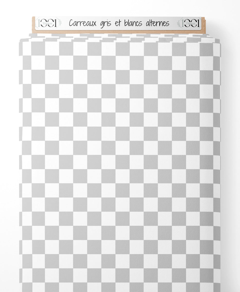 Carreaux gris et blancs sur fond alterné. Motif géométrique simple et répétitif.Les tissus