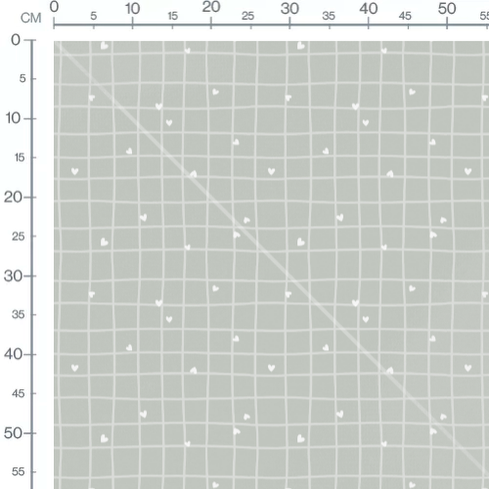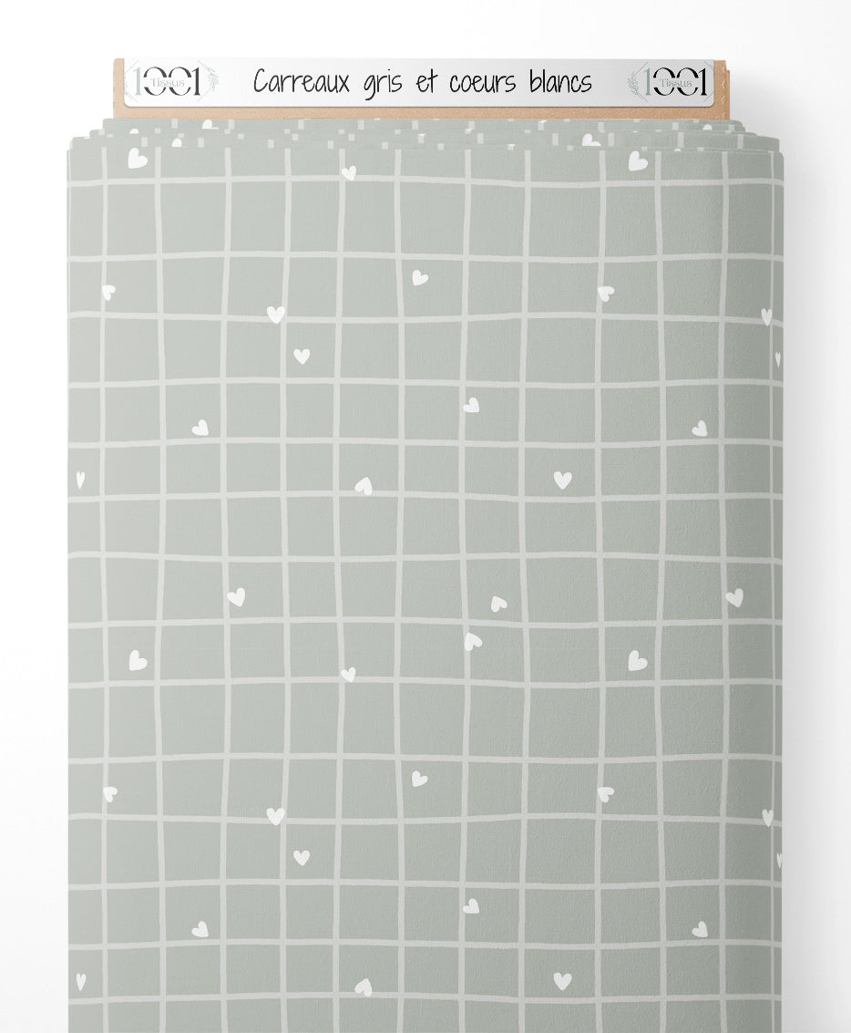 Les cœurs blancs sont dispersés sur un motif de carreaux gris. Le fond gris clair ajoute une touche douce et neutre.Les tissus