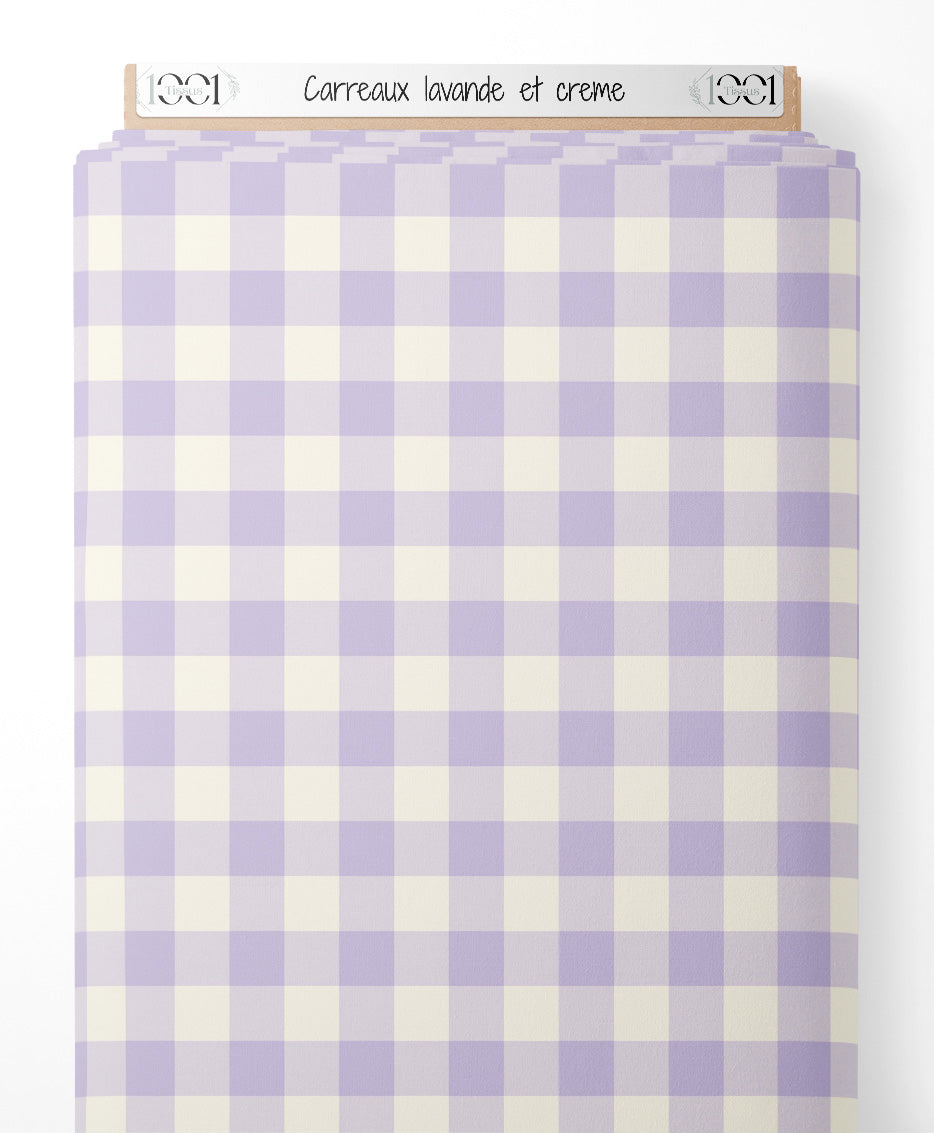 Les carreaux sont de taille uniforme et alternent entre lavande et crème. Le motif crée un effet visuel équilibré et harmonieux.Les tissus