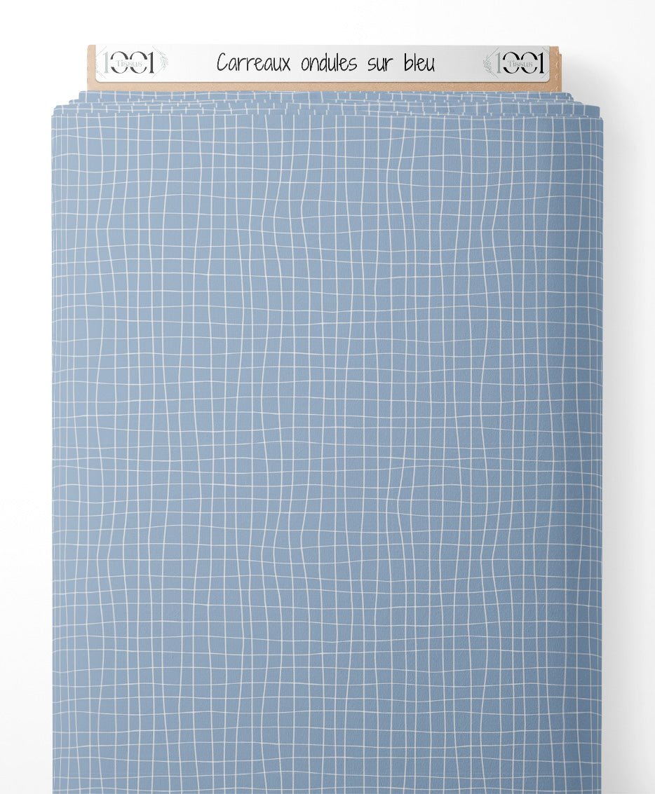 Les carreaux blancs forment un motif ondulé sur le fond bleu. Le design est régulier et crée un effet visuel dynamique.Les tissus