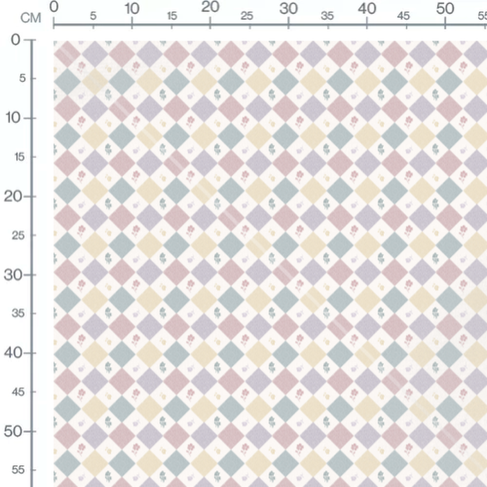 Les carreaux présentent une texture subtile et des couleurs pastel douces. Les fleurs ajoutent une touche délicate et contrastent avec les formes géométriques. Le fond crème met en valeur les motifs colorés.Les tissus