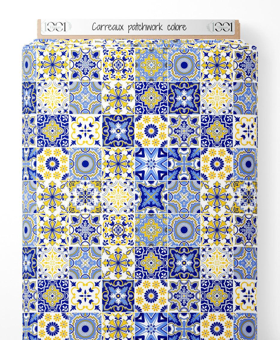 Les motifs incluent des formes florales et des arabesques complexes. Les couleurs principales sont le bleu, le jaune et le blanc. Chaque carreau présente un design unique avec des éléments géométriques variés. Les motifs sont disposés en un patchwork harmonieux.Les tissus